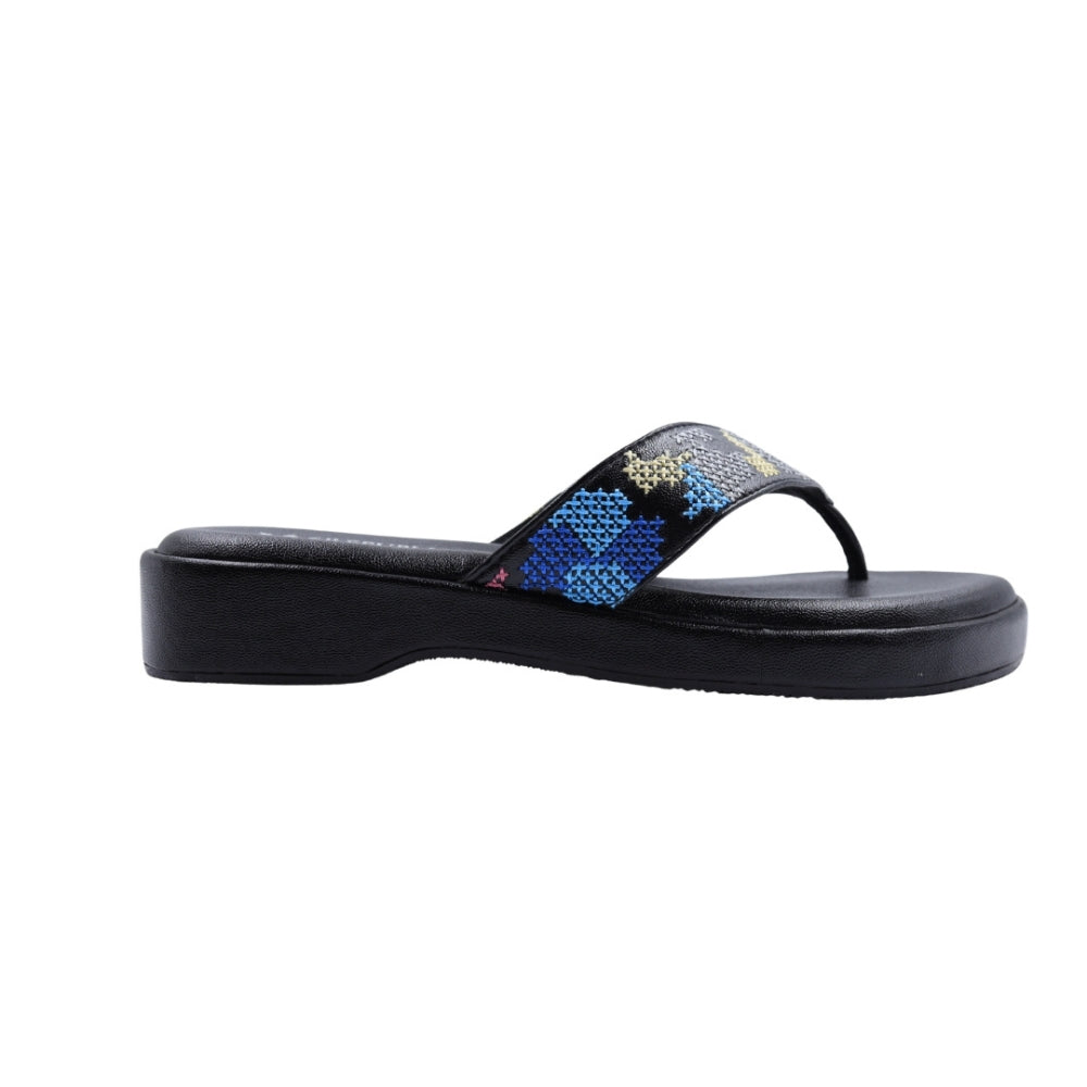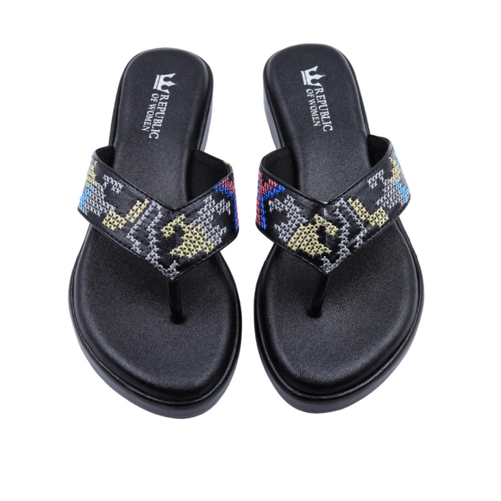 Command attention with every intricate detail. These striking black sandals feature a beautifully woven strap adorned with a multi-hued geometric pattern that blends heritage and modern sophistication. Designed with a comfortable toe-post design and a cushioned sole, they offer enduring elegance and support for the queen whose confidence is woven into her style.