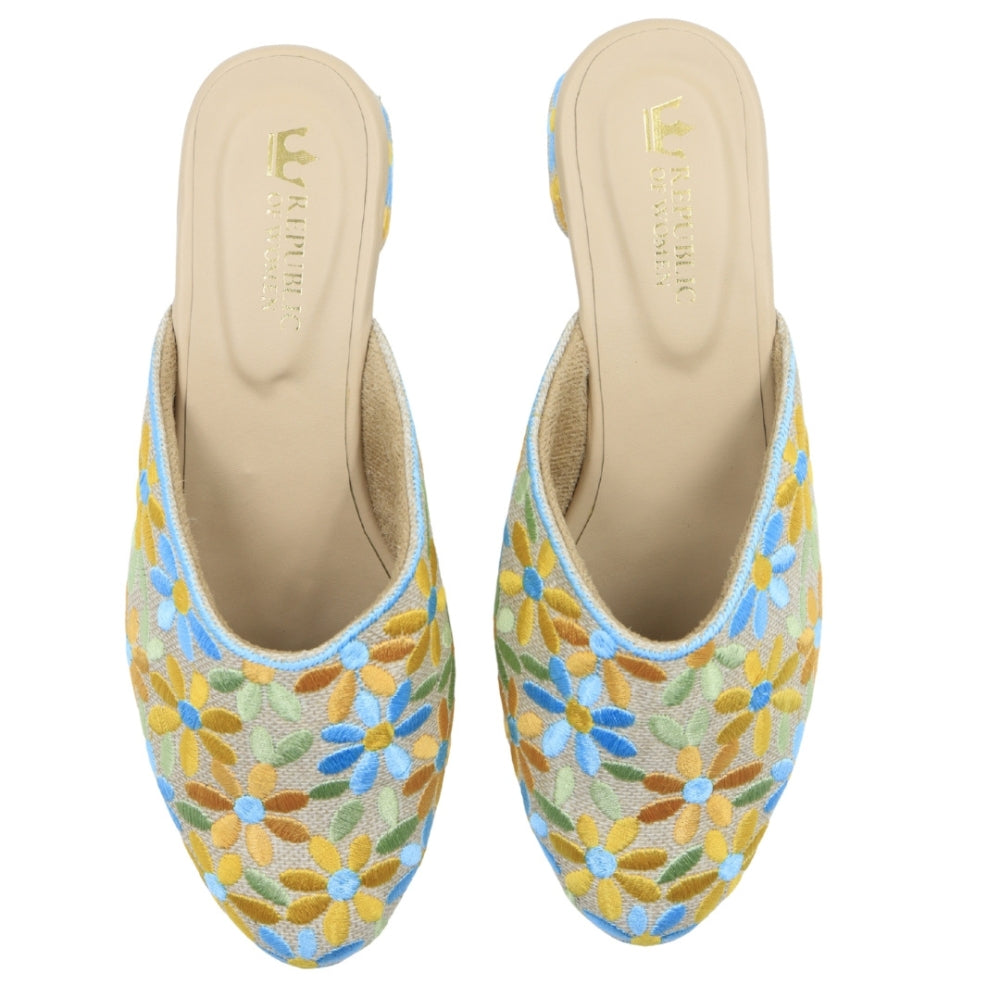 "Elevate your ensemble with the timeless charm of an eternal garden. These sophisticated mules feature all-over embroidery in warm tones of coral, red, and sage green on a refined beige mesh base. The comfortable block heel and closed pointed toe offer elegant structure, while the cushioned insole ensures lasting poise. For the queen who cultivates beauty with every elevated step.