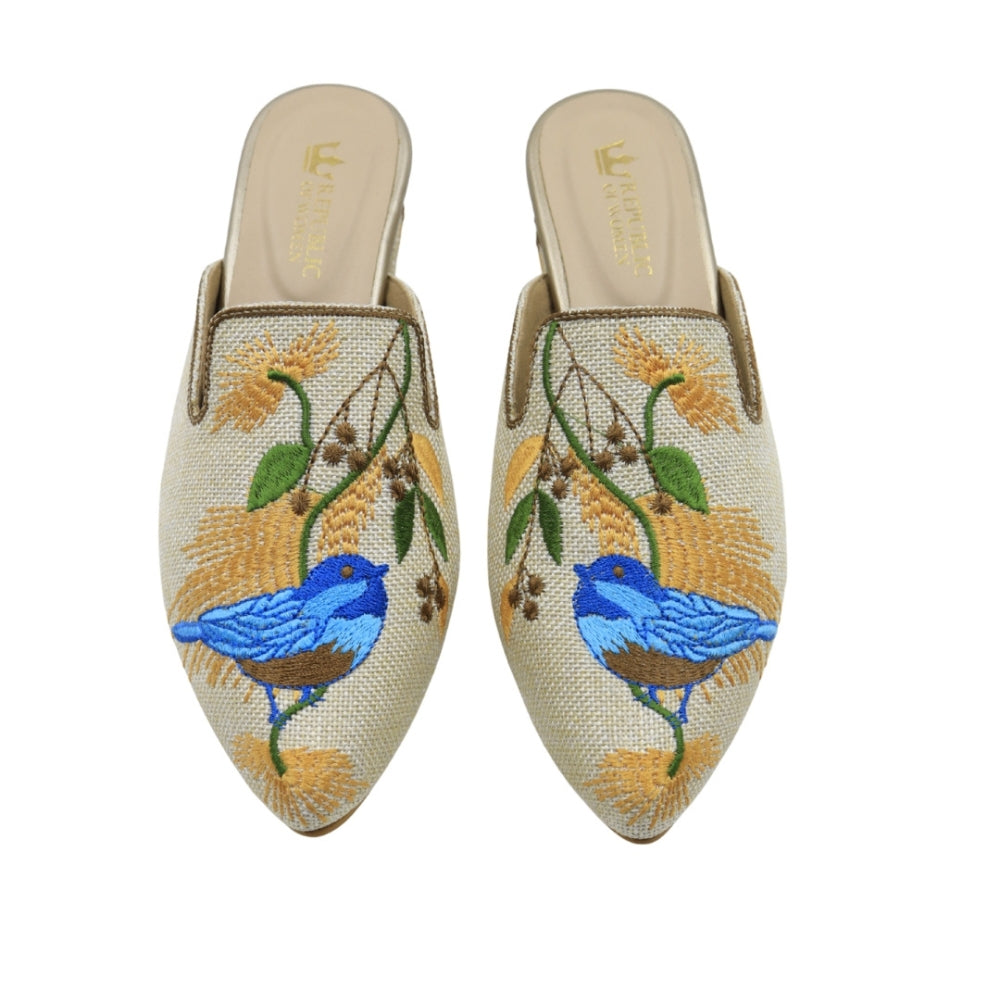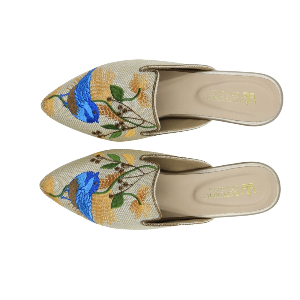 Let elegance take flight. These stunning pointed-toe mules feature intricate embroidery of a vivid blue bird perched amidst golden foliage on a natural linen-look base. The comfortable block heel offers a graceful lift, while the rich, handcrafted detail ensures a sophisticated statement piece. For the queen whose voice is beautiful and whose style is timeless.
