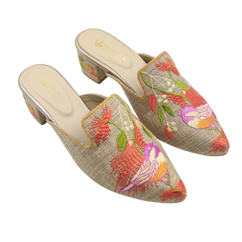 Adorn your walk with the majesty of nature's jewels. These striking pointed-toe mules feature intricate embroidery of a vibrant pink and orange bird perched amidst warm coral foliage on a refined linen-look base. The comfortable block heel offers a graceful lift, while the rich, handcrafted detail ensures a sophisticated statement piece. For the queen whose presence is as rare and captivating as a tropical songbird.