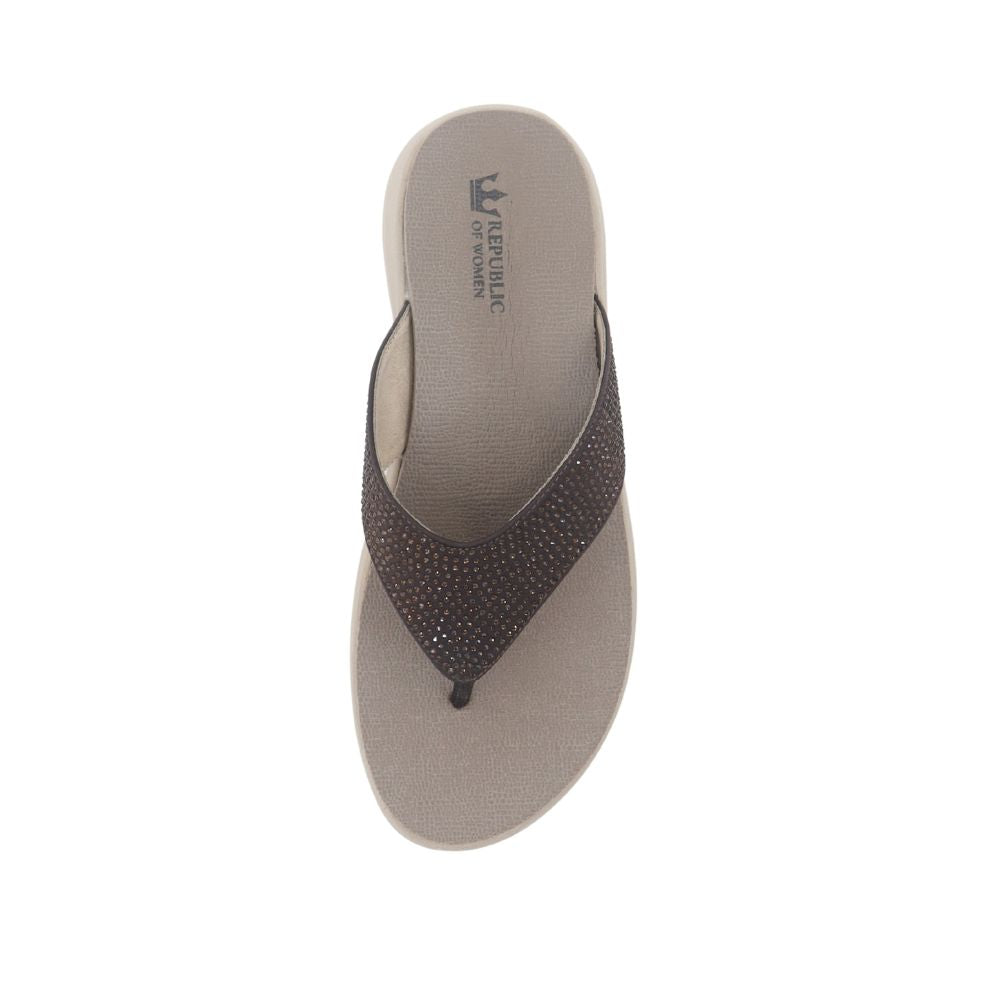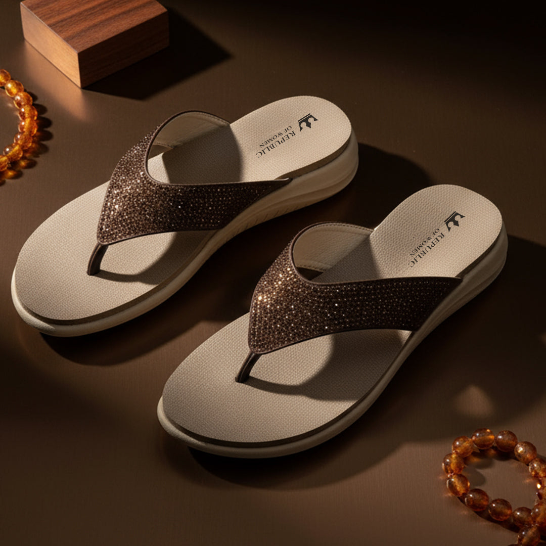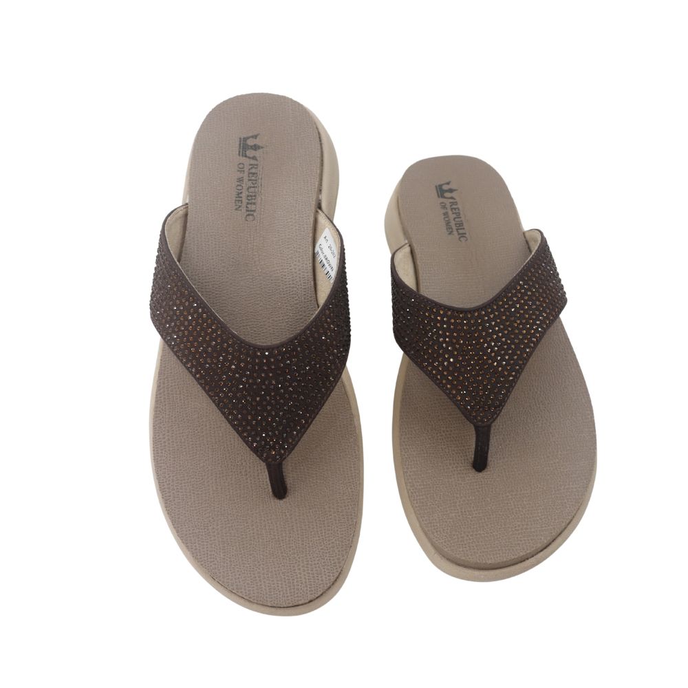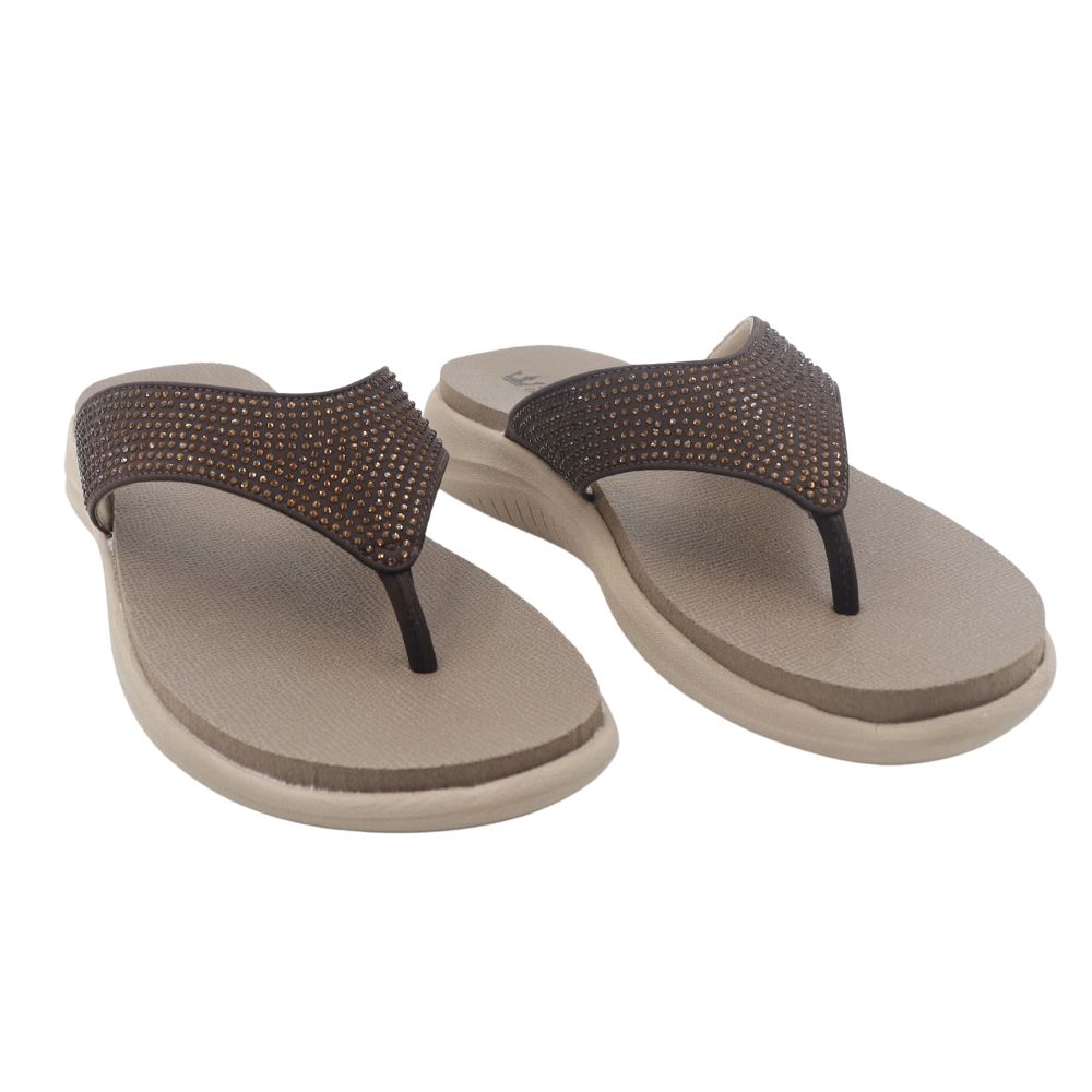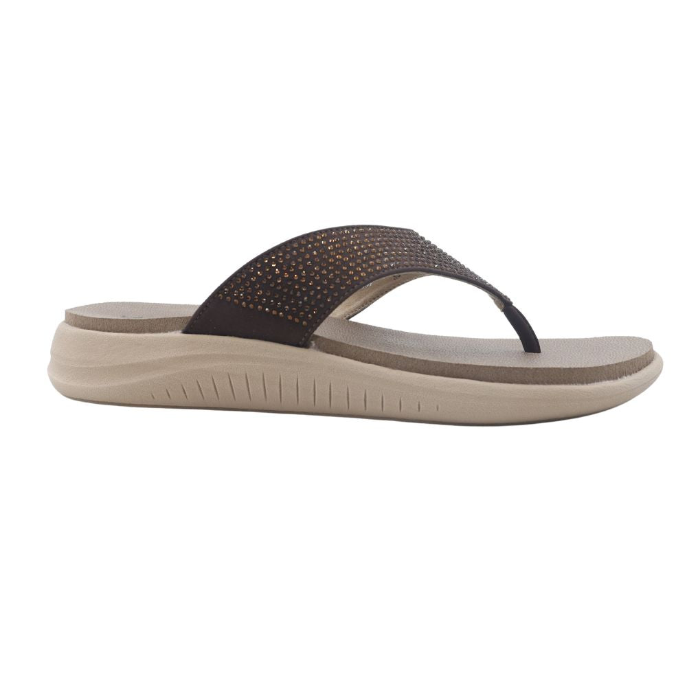 Add a touch of warm elegance to your casual wear with the Bronze Radiance sandal. This comfortable toe-post style features a lightweight, cushioned EVA sole for all-day ease. The wide strap is blanketed in rich brown-toned rhinestones, offering a sophisticated glimmer that beautifully complements the sandal's warm hues. It’s the perfect slip-on for effortless, everyday glamour.