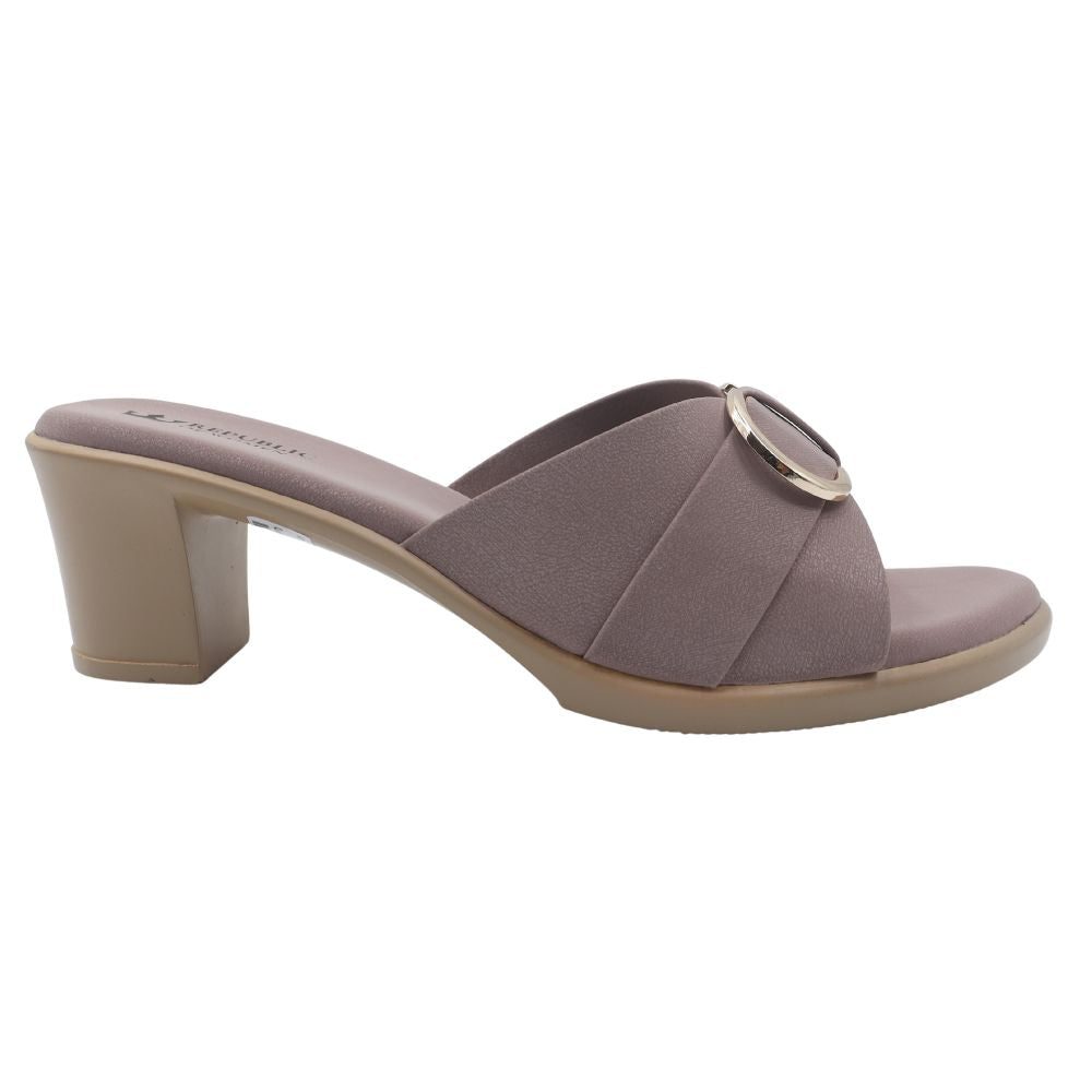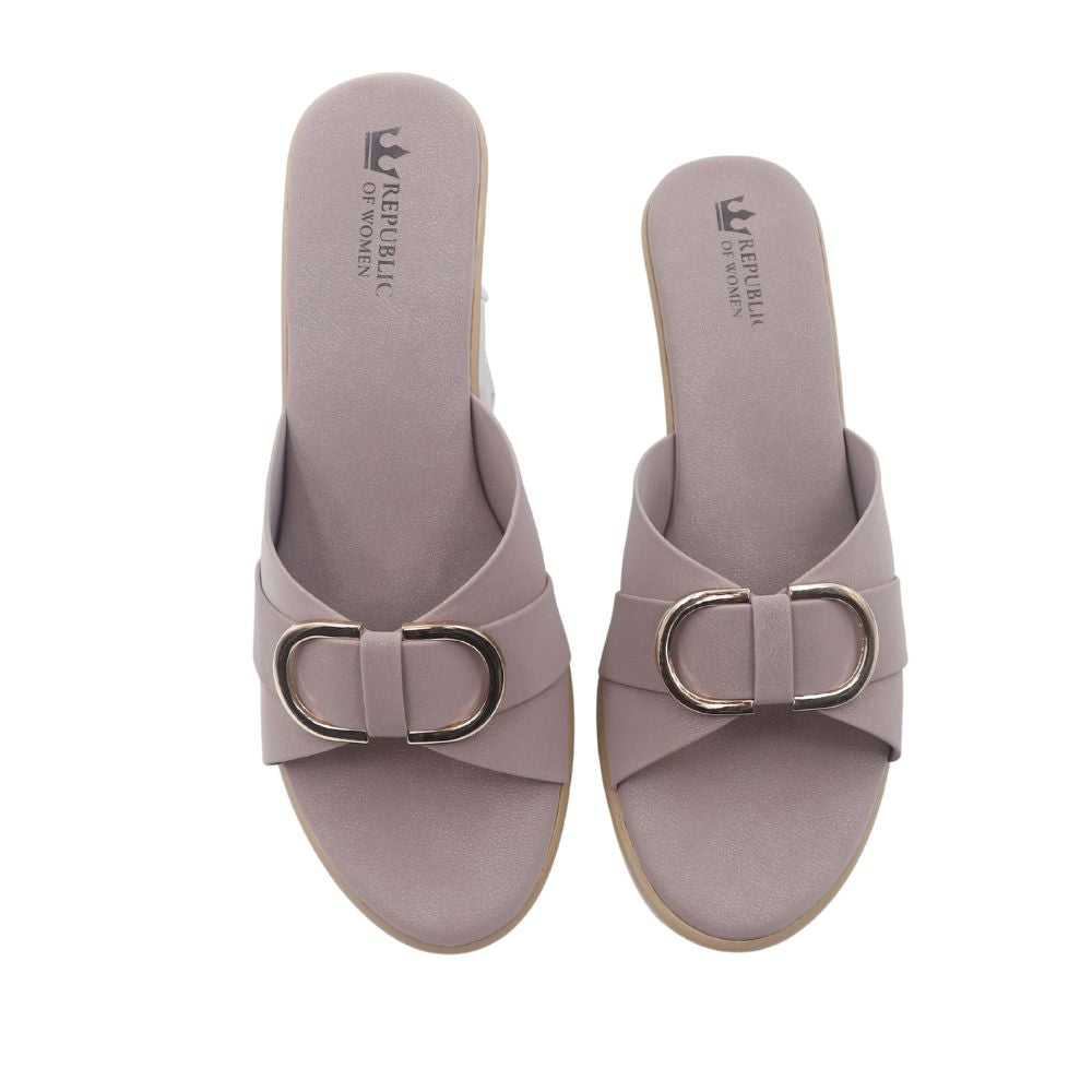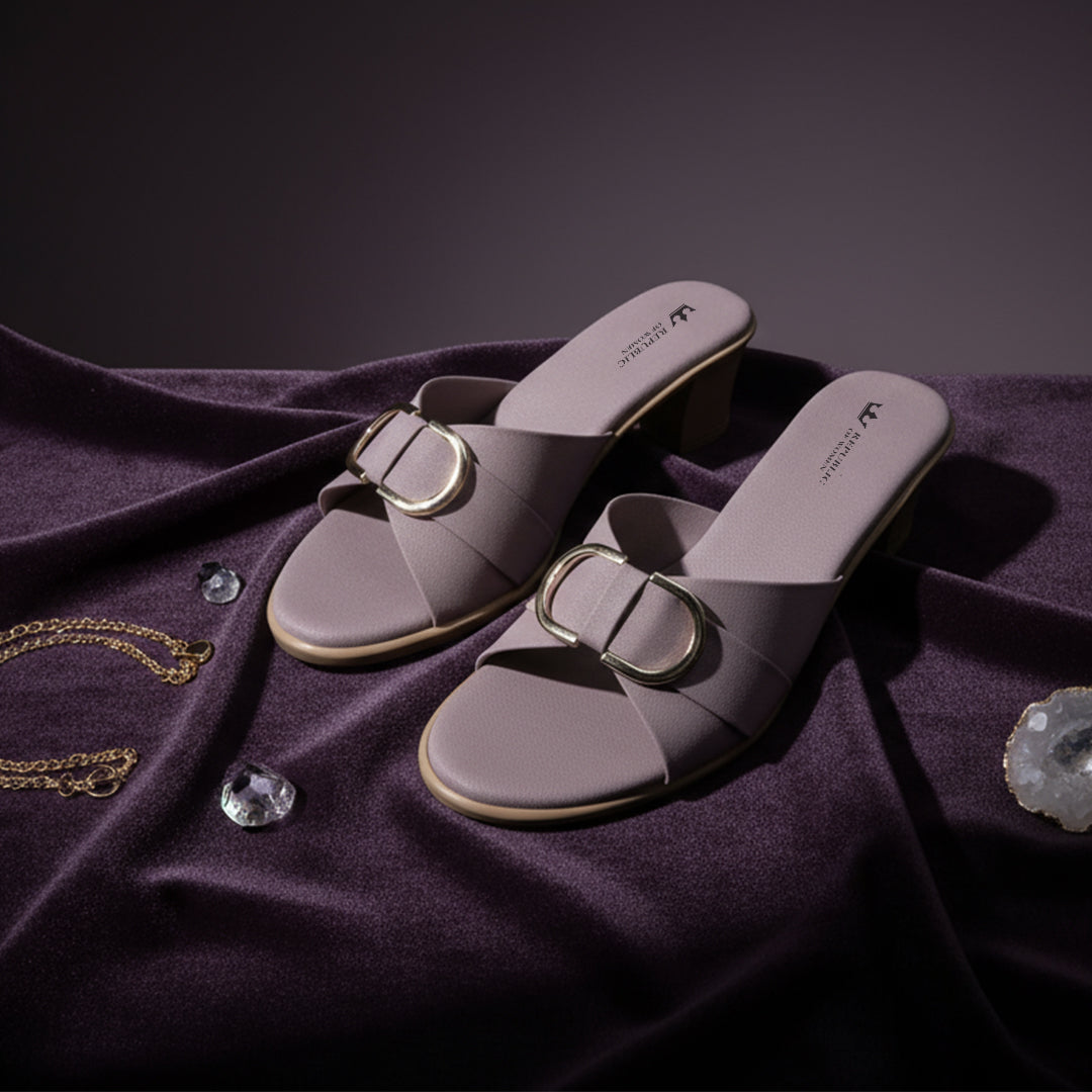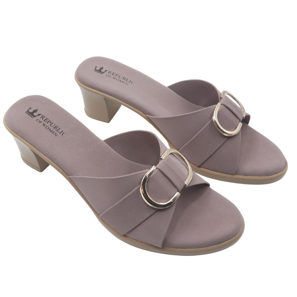 Define your look with the Buckle Muse mule. This elegant sandal combines a soft, dusty lavender hue with a chic, modern silhouette, perfect for elevating any outfit. The forefoot features a subtle twist detail, accented by a bold, circular metallic buckle that commands attention. Set on a comfortable low block heel, this slip-on mule offers sophisticated style and ease, making it ideal for the office or an evening out.