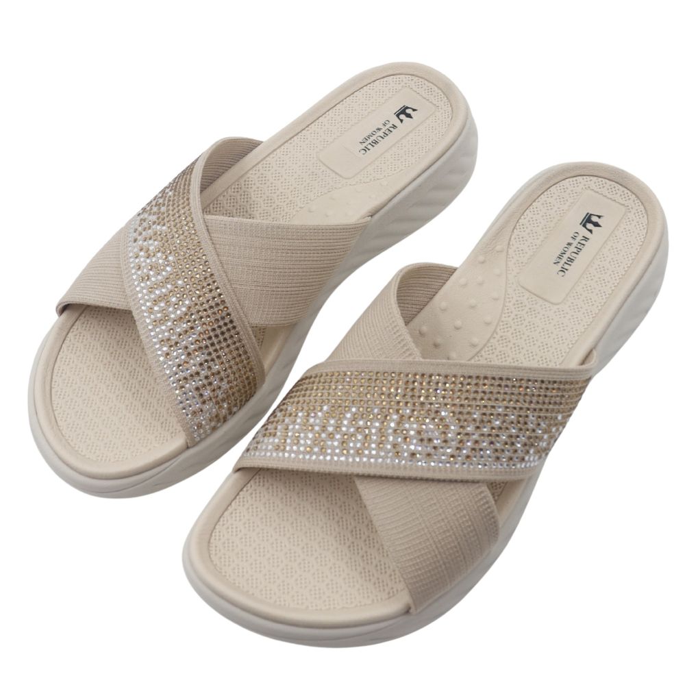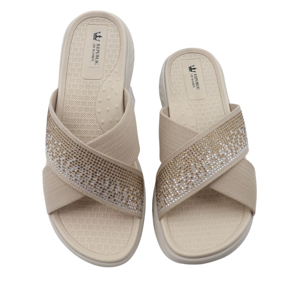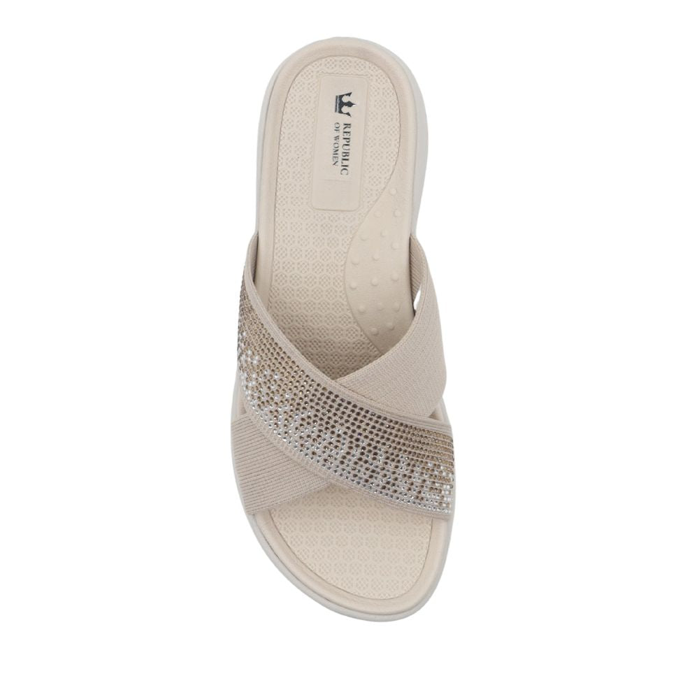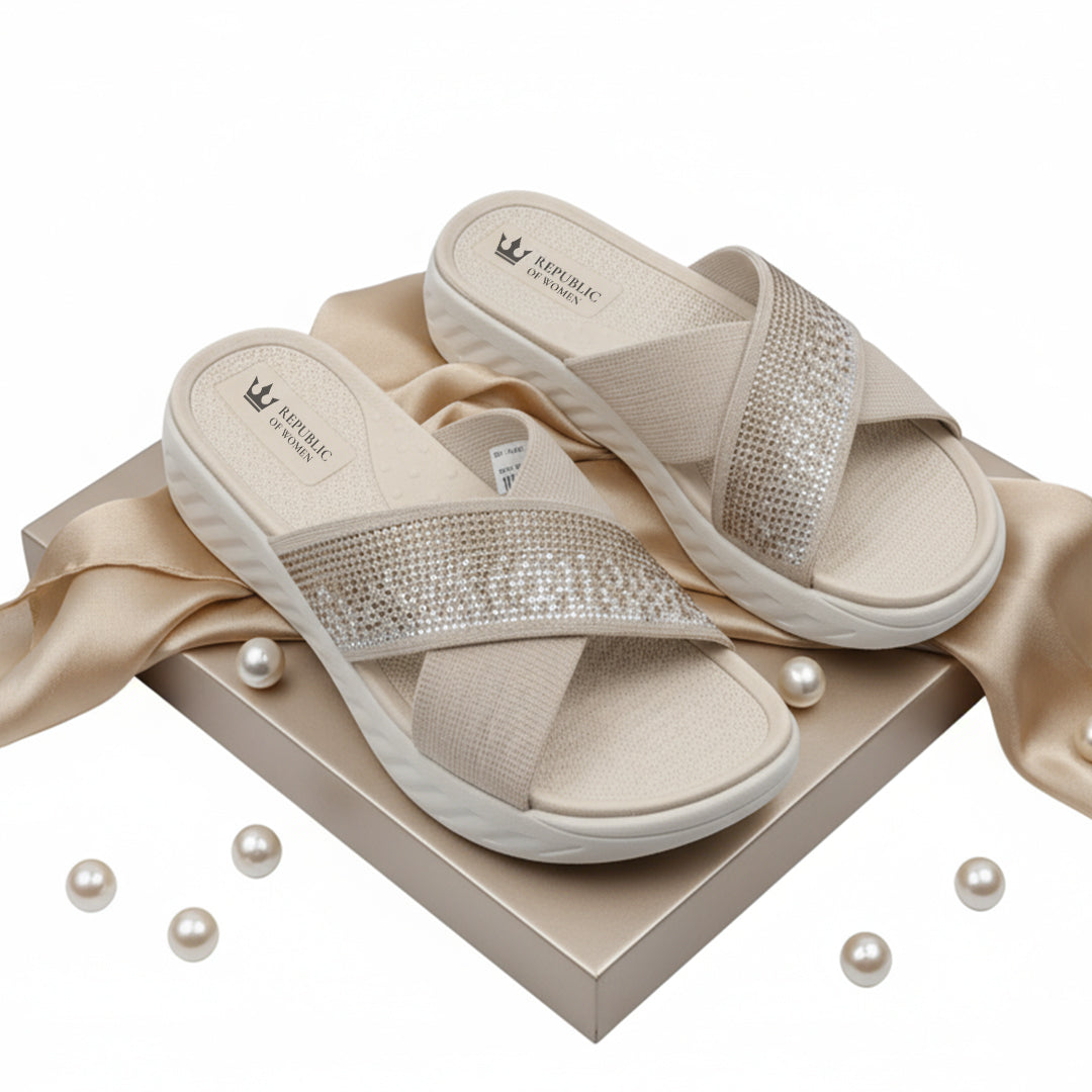Elevate your comfort with the Criss-Cross Sparkle slide. Designed for seamless style and ease, this sandal features a wide, elegant criss-cross strap completely adorned with dazzling rhinestone embellishments. The neutral beige tone ensures versatile pairing, while the cushioned sole provides lightweight, all-day support. This slide is the perfect choice for adding effortless glamour to your everyday looks.