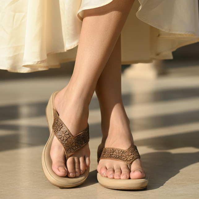 Bloom in style with the Floral Glimmer sandal. This charming toe-post style features a flattering strap adorned with delicate floral cutout patterns and a touch of sparkle from fine rhinestones. The rich  Gold tone is versatile and warm, ensuring this sandal adds effortless elegance to any casual look while the cushioned sole provides lasting comfort.