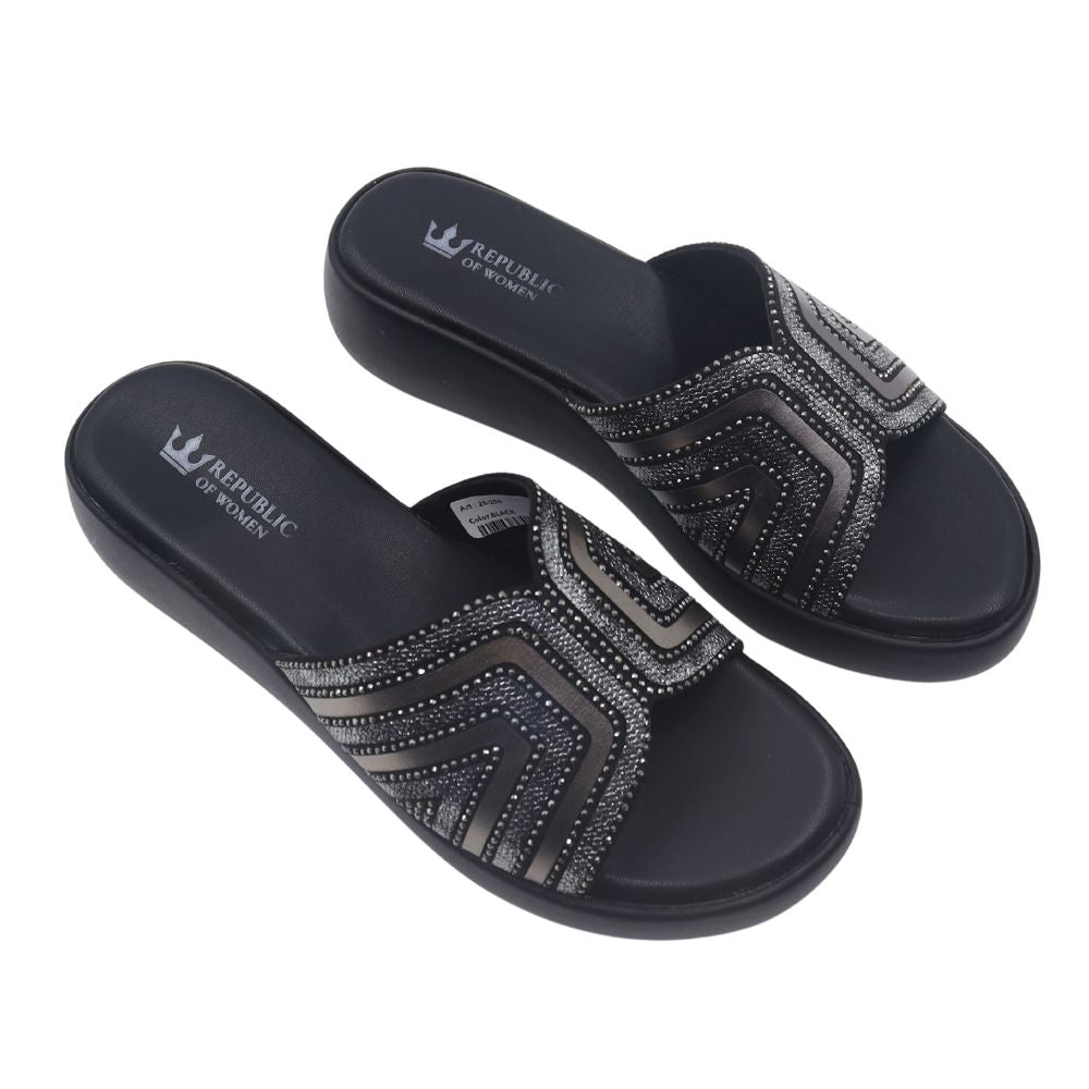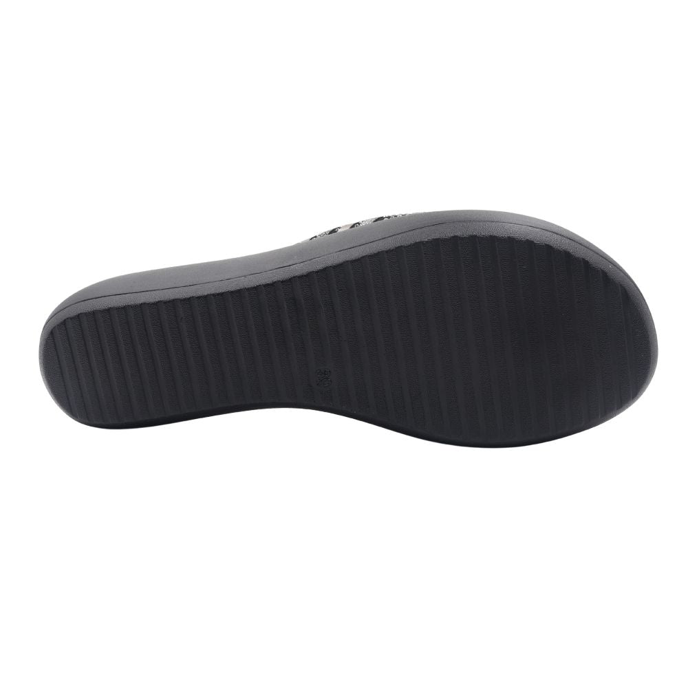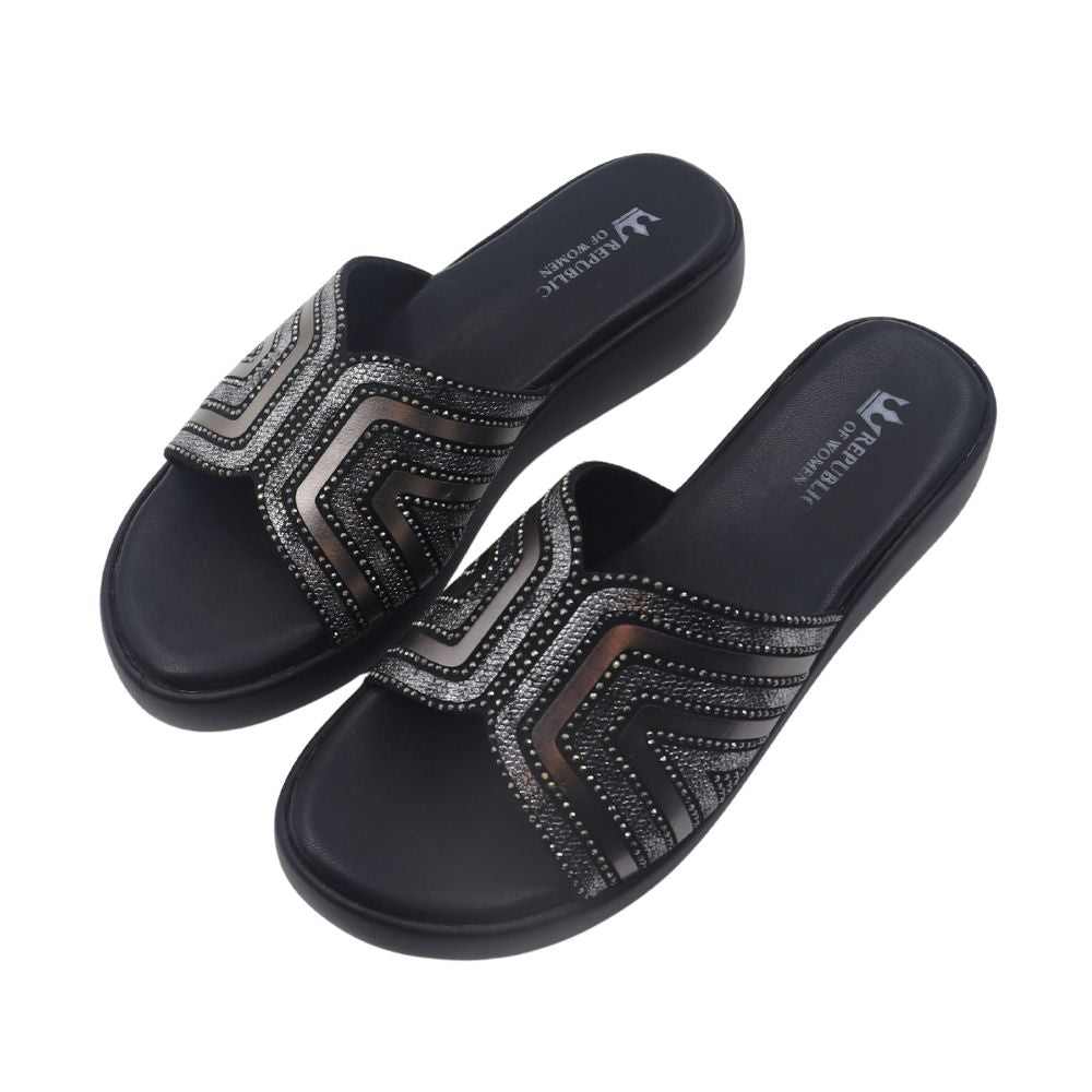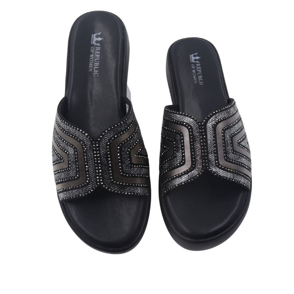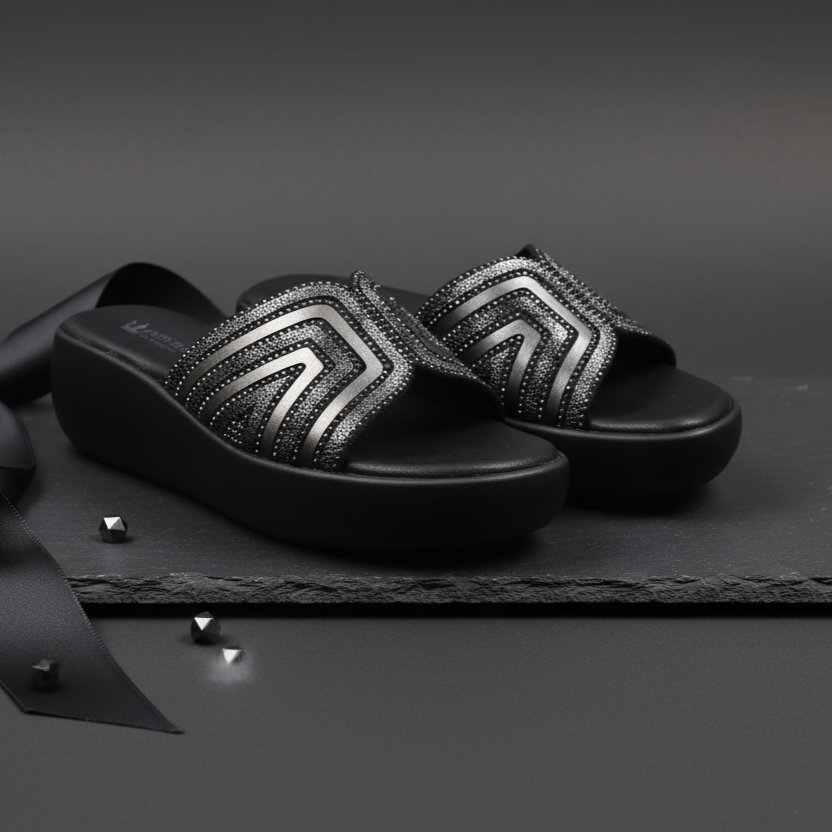 Make a statement with the Geo Slide sandal. This eye-catching black wedge features a bold, wide strap dominated by striking metallic chevron patterns. The modern geometric design is both structured and dynamic, providing an instant update to any casual outfit. With a comfortable sole and effortless slip-on style, the Geo Slide delivers sophisticated style without compromising on comfort.
