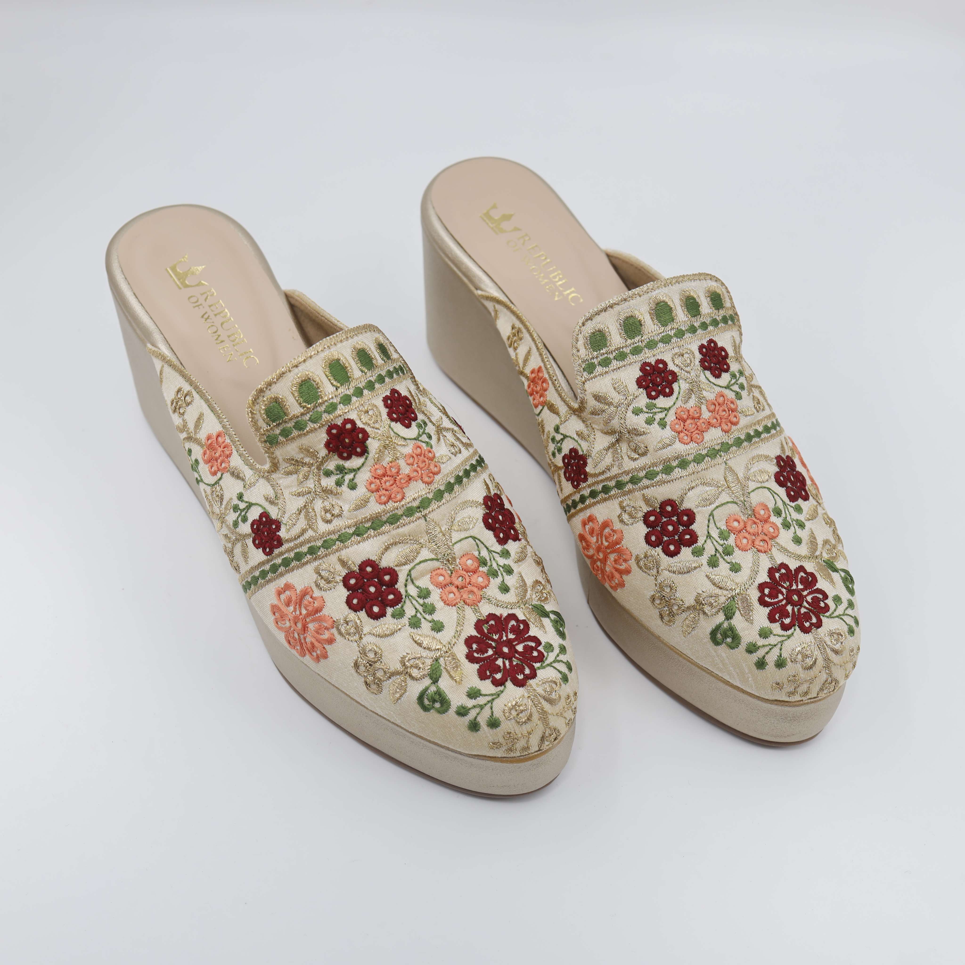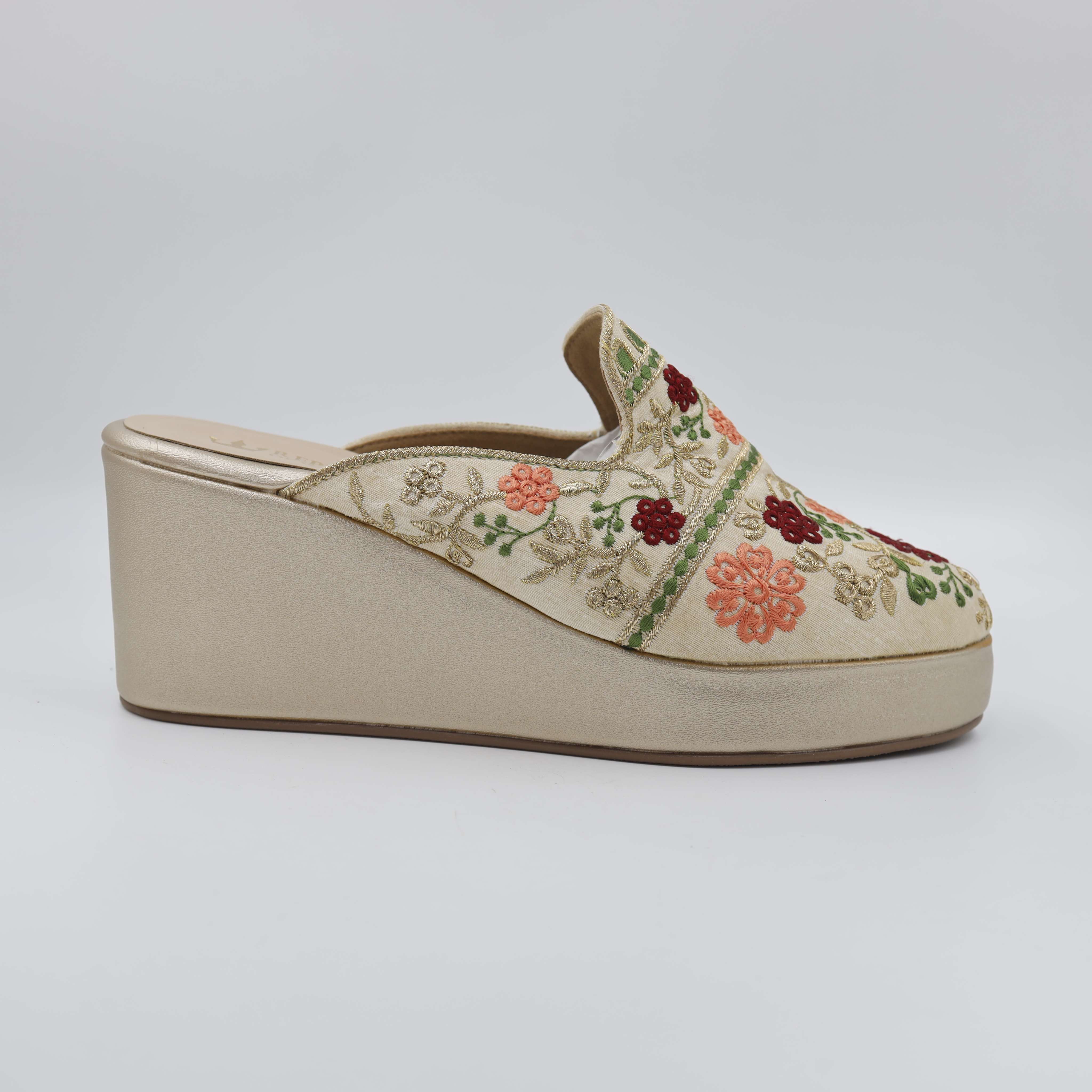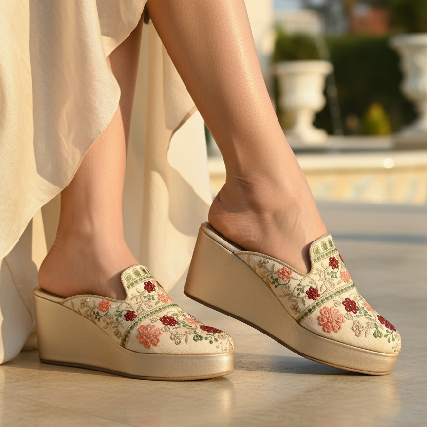 Adorn your stride with the timeless majesty of the Gilded Flora wedges. A vision of elegance, these handcrafted shoes feature a soft gold canvas intricately embroidered with vibrant floral motifs in emerald, ochre, and crimson. Designed to let you move with effortless poise, this regal pair is set on a sophisticated 3-inch heel that offers both stature and comfort for the discerning woman.