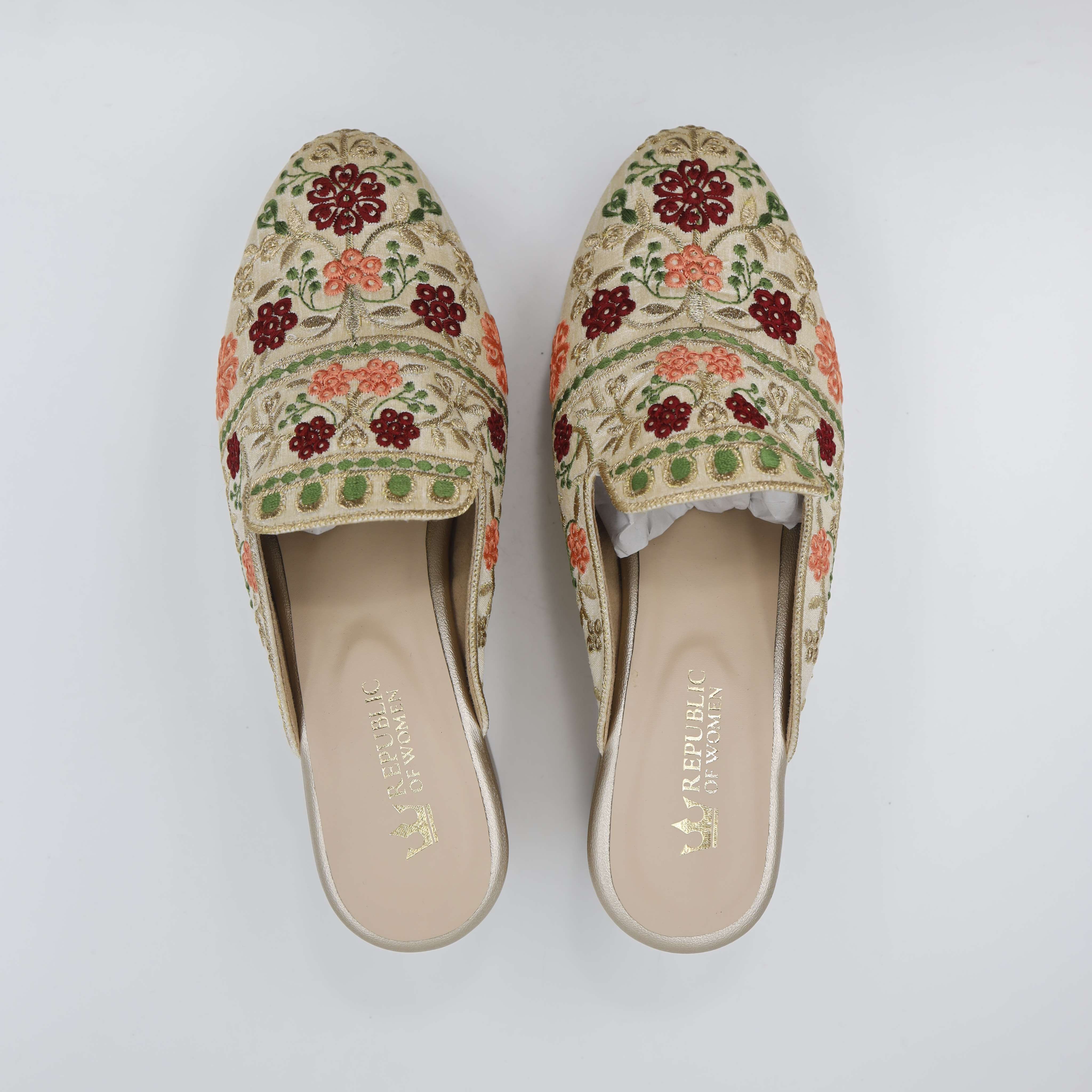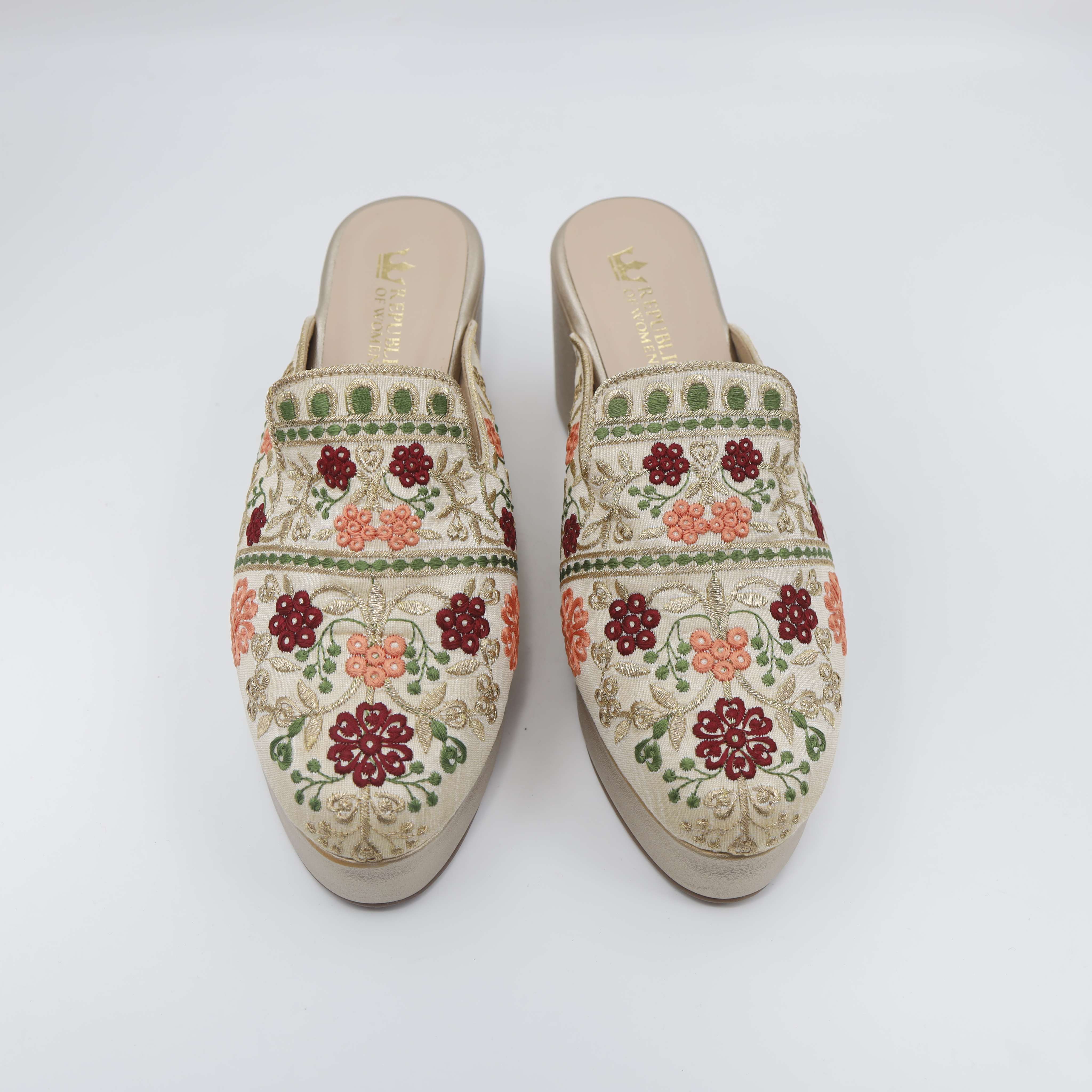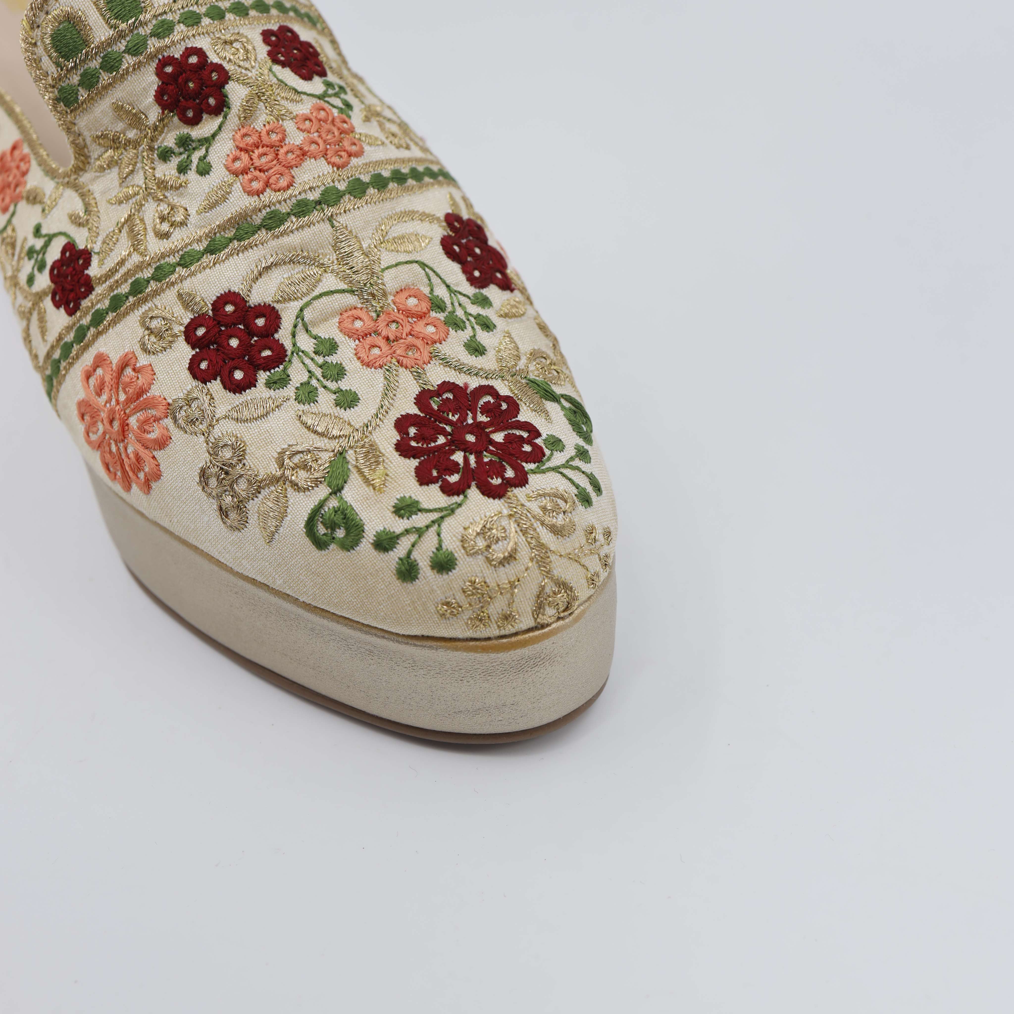 Adorn your stride with the timeless majesty of the Gilded Flora wedges. A vision of elegance, these handcrafted shoes feature a soft gold canvas intricately embroidered with vibrant floral motifs in emerald, ochre, and crimson. Designed to let you move with effortless poise, this regal pair is set on a sophisticated 3-inch heel that offers both stature and comfort for the discerning woman.