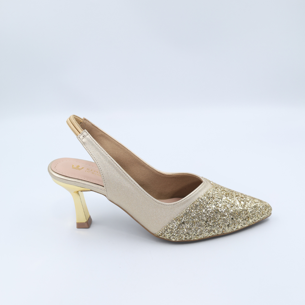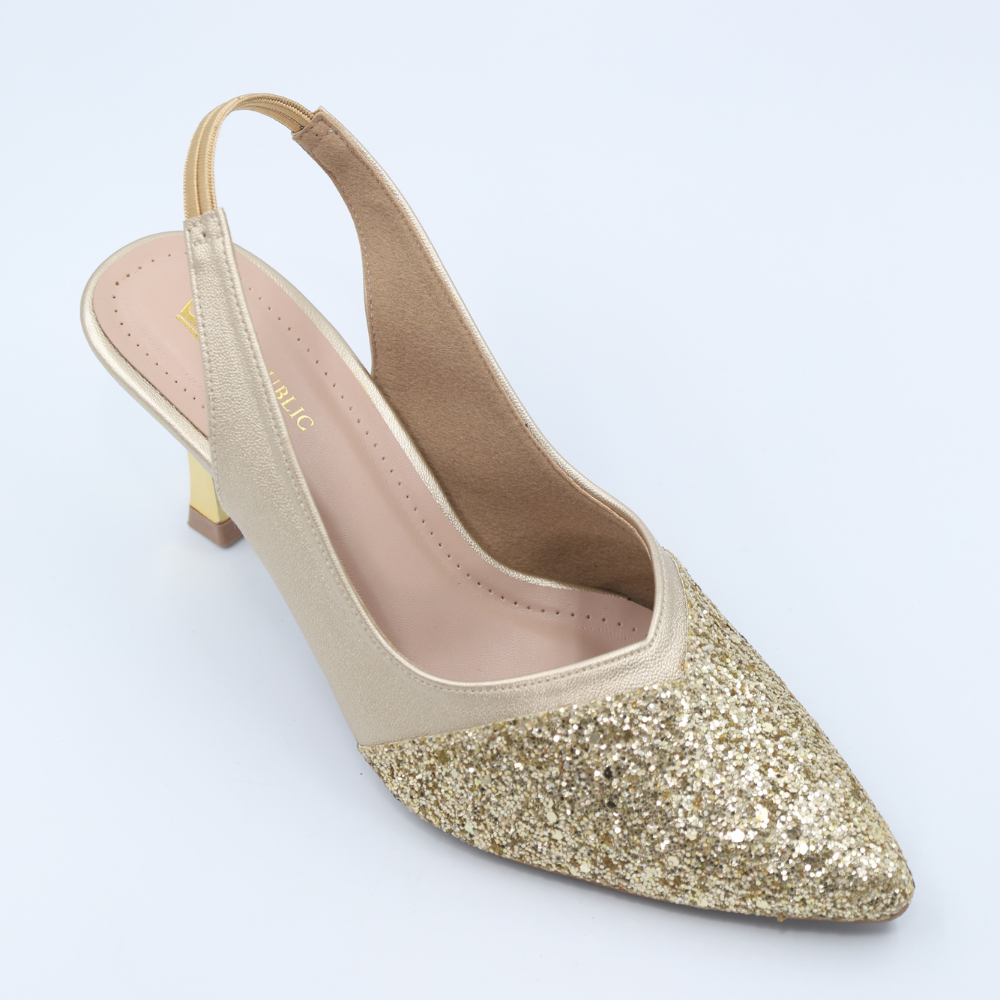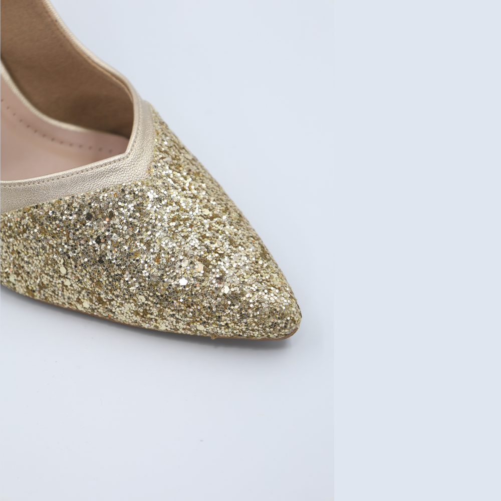Crafted for the woman who demands elegance without sacrificing comfort, these pointed-toe slingbacks are the definitive choice for any celebration. The dazzling Gold Synthetic upper catches the light with every move, making them the perfect centerpiece for your evening ensemble. Beneath the shimmer, you'll find a resilient TPU Sheet sole, providing reliable grip and flexibility so you can dance the night away.