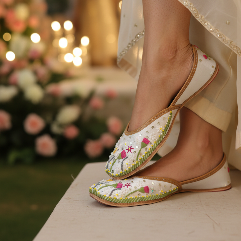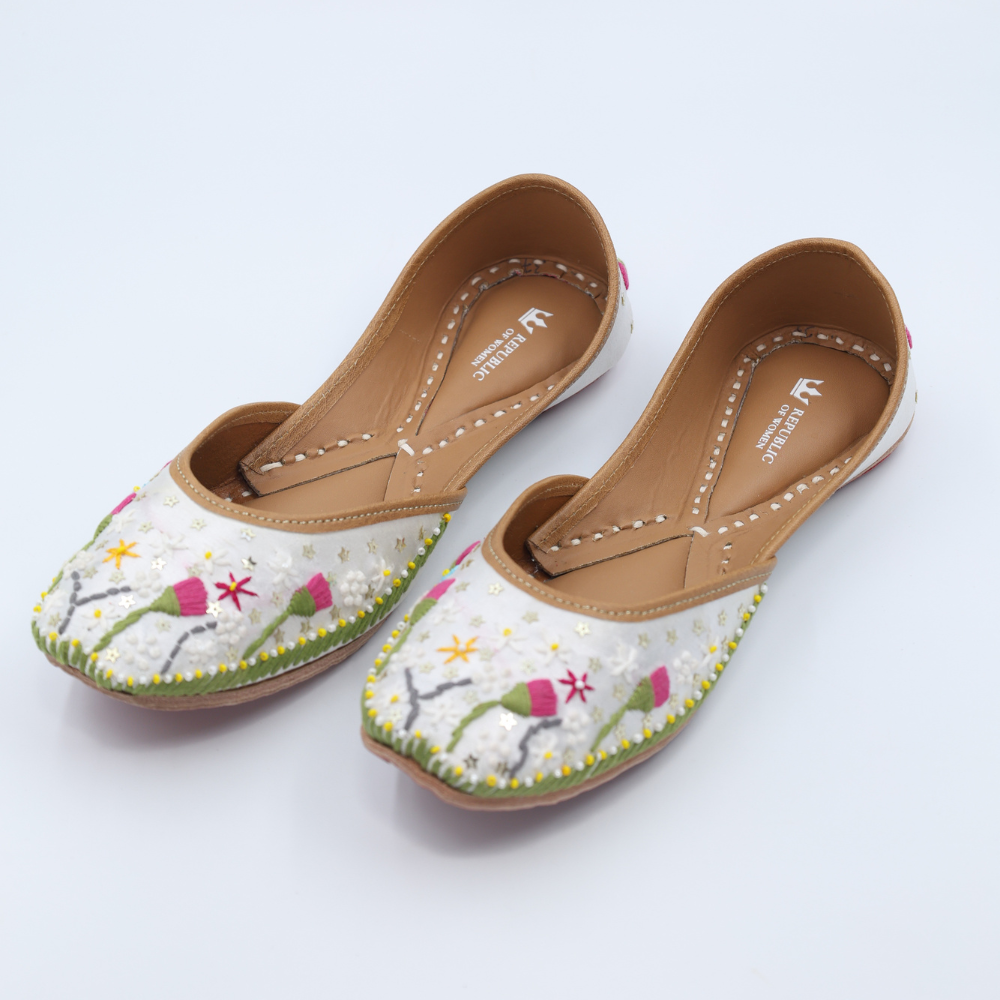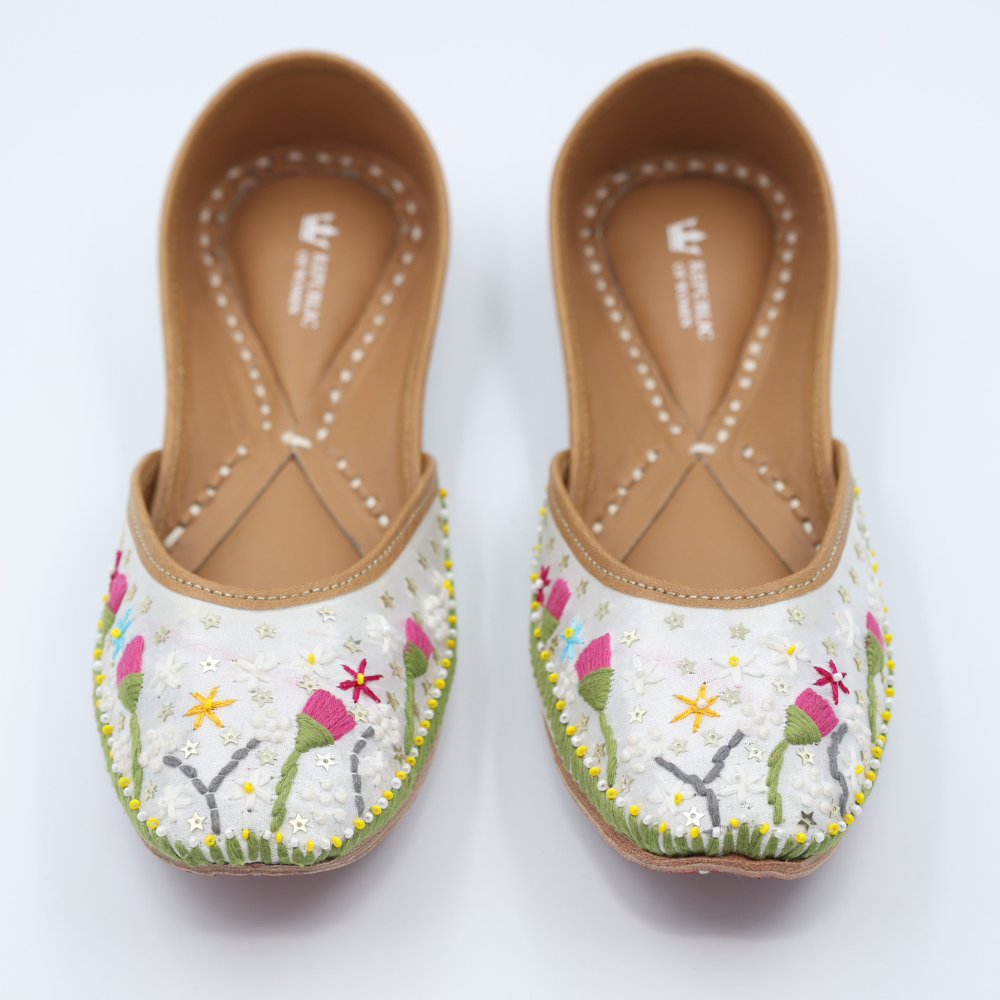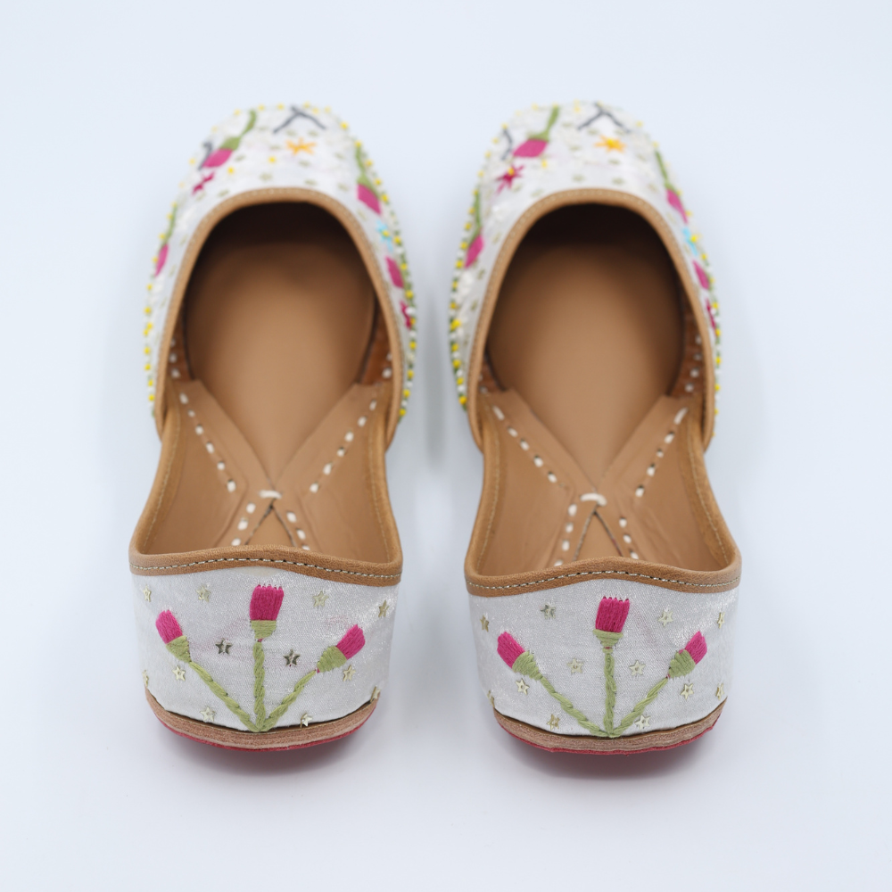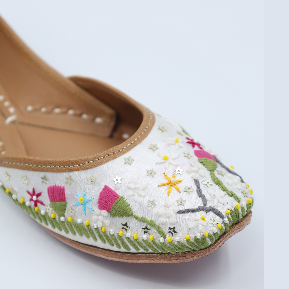 Fresh, soft, and full of whimsy, these white mojris bloom with lavender buds, playful yellows, and dreamy greens. It’s like walking through a field of wildflowers, but make it fashion. Light on the feet, heavy on the charm.