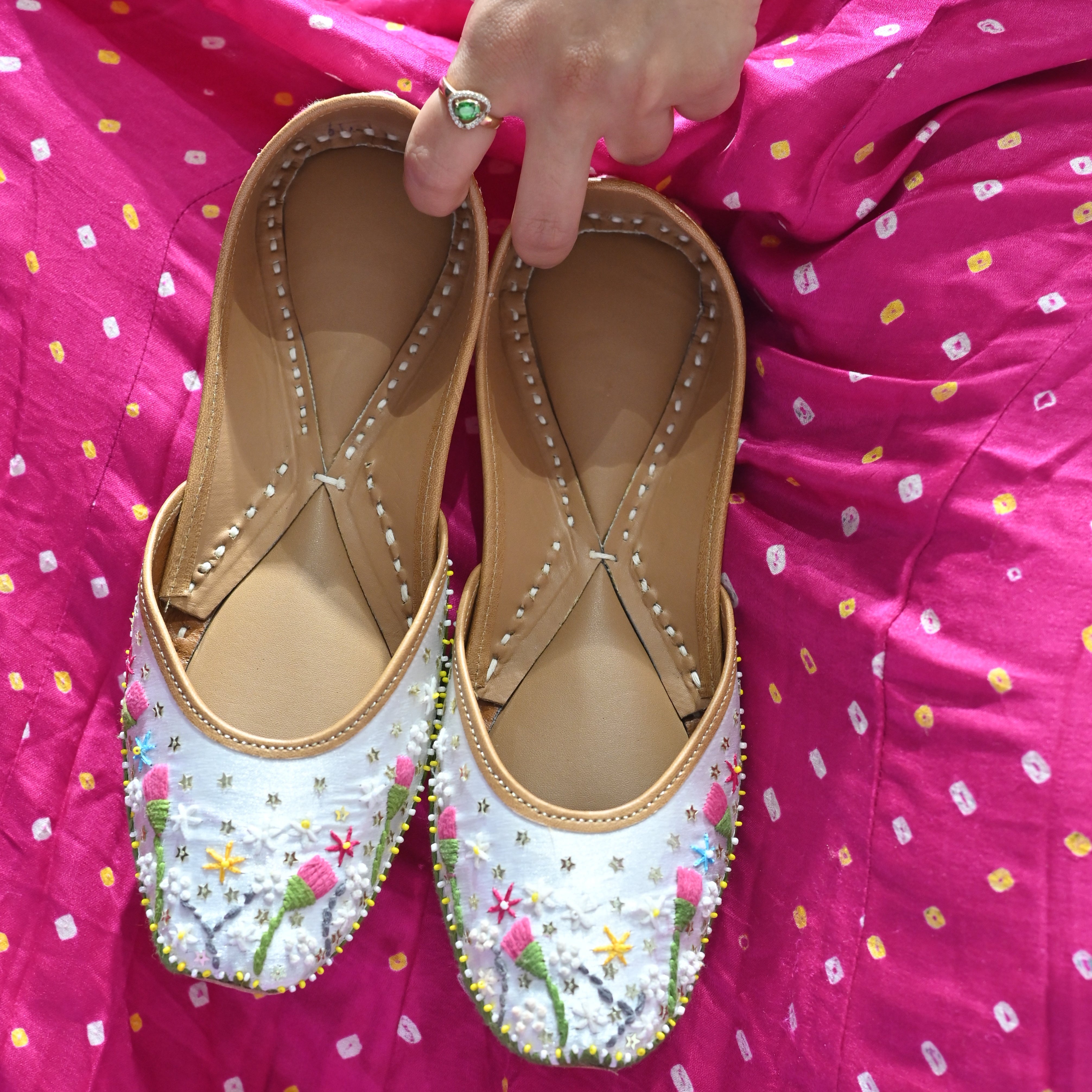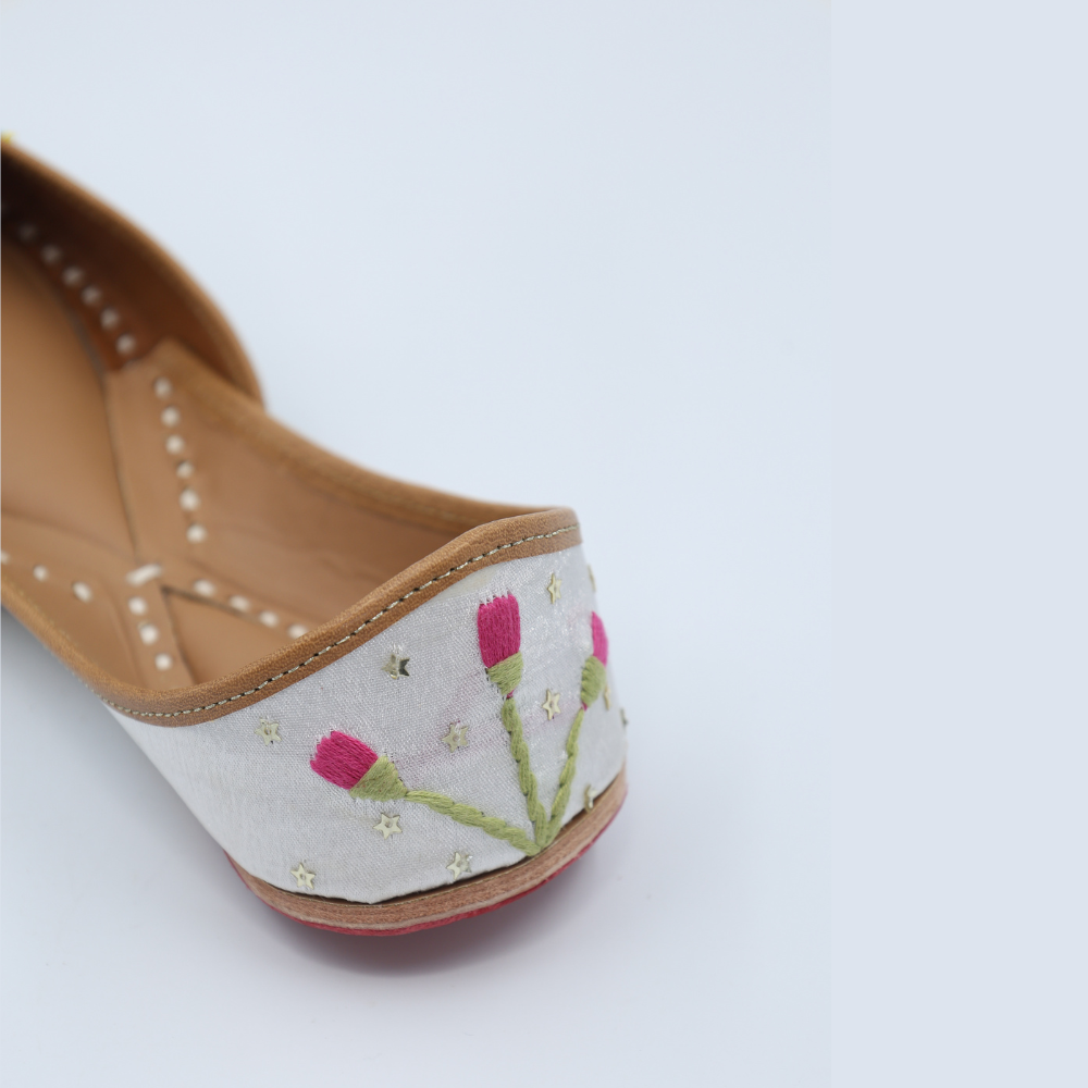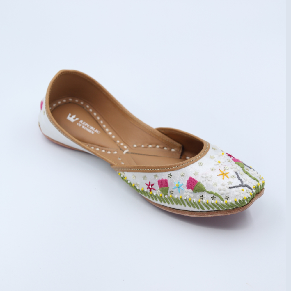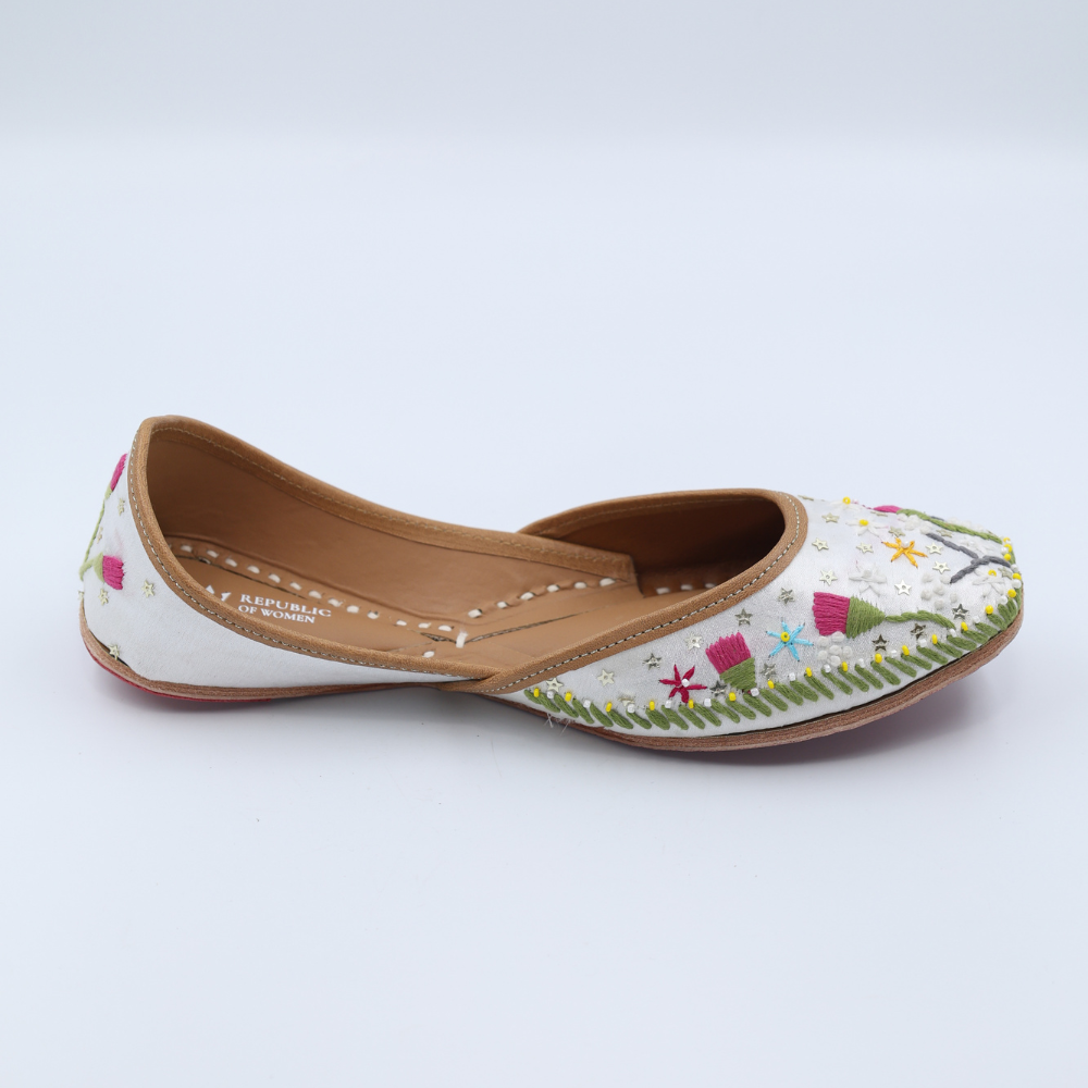 Fresh, soft, and full of whimsy, these white mojris bloom with lavender buds, playful yellows, and dreamy greens. It’s like walking through a field of wildflowers, but make it fashion. Light on the feet, heavy on the charm.