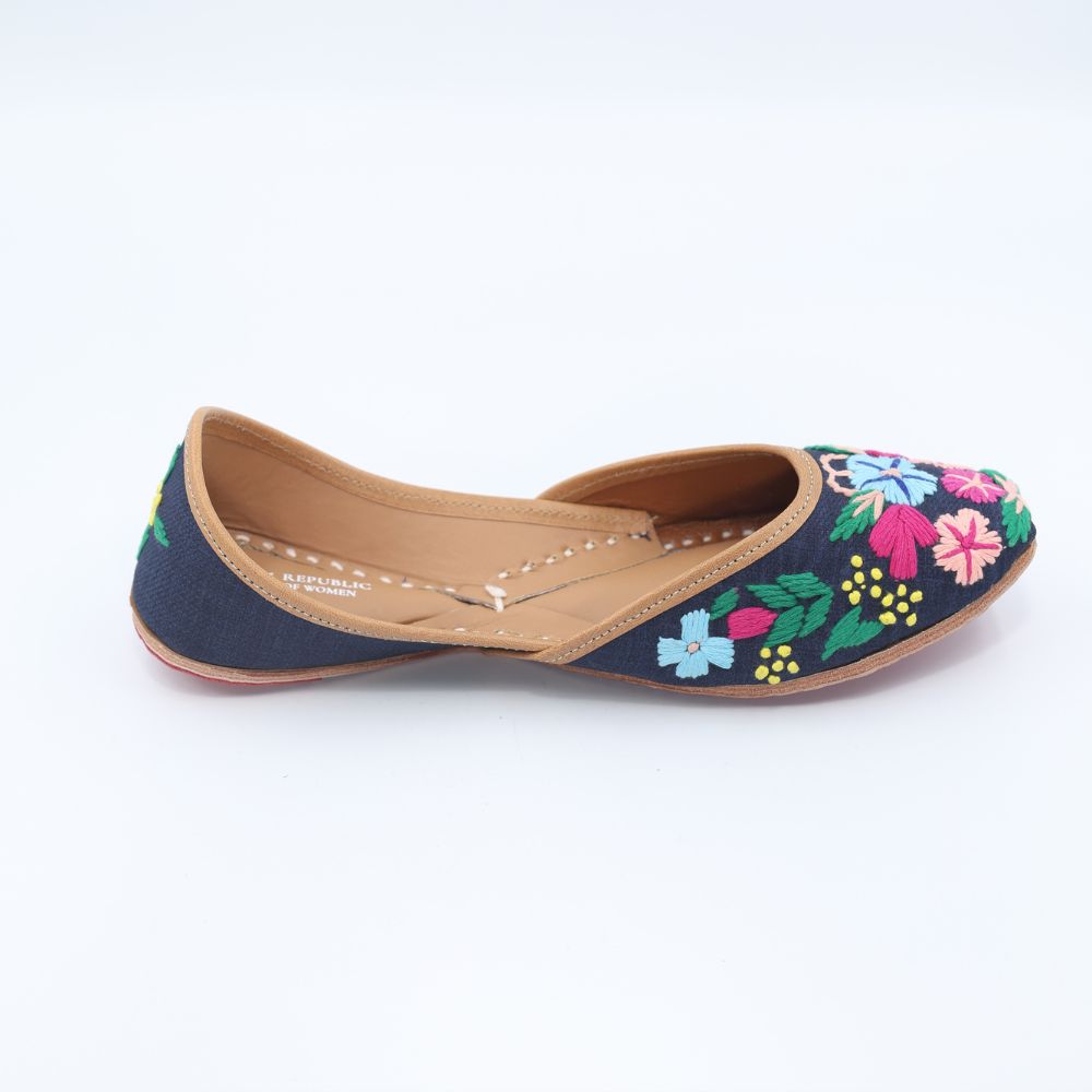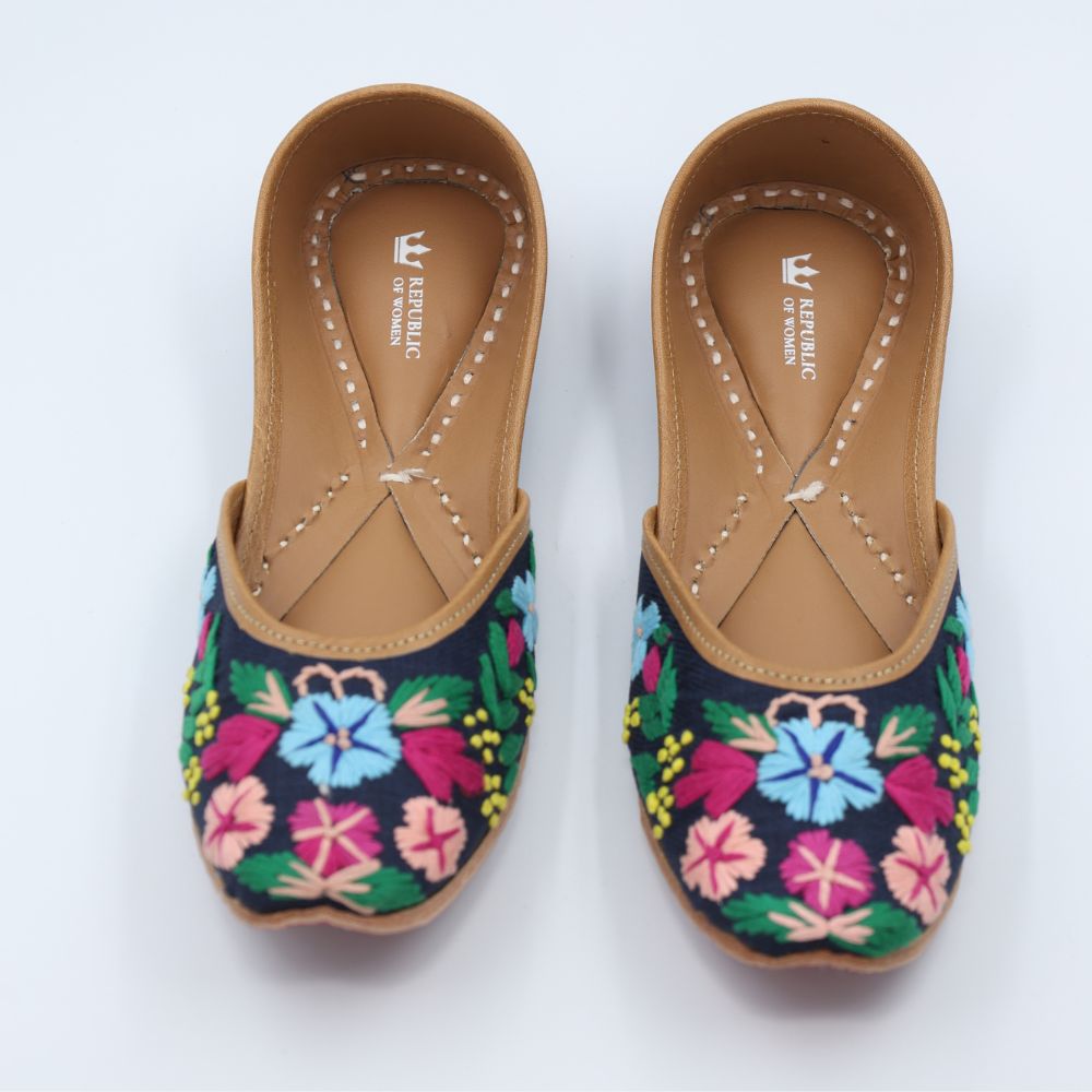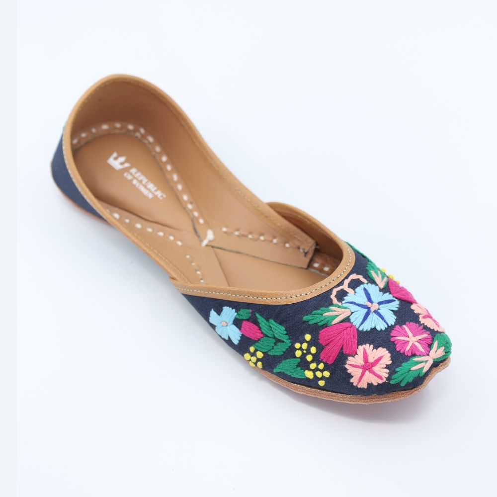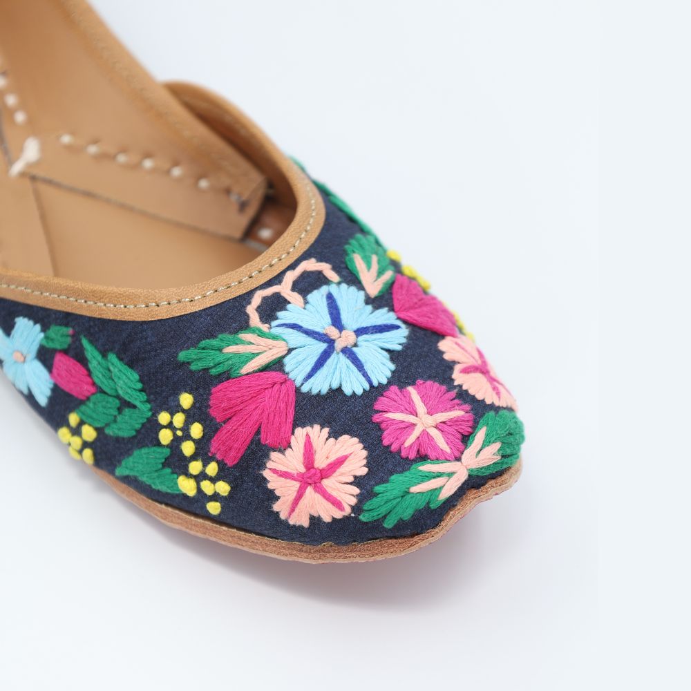 Bold blooms on a deep navy base, this pair is all about contrast and confidence. With intricate multicolour florals embroidered across a midnight canvas, these mojris are your go-to for adding power to pretty.