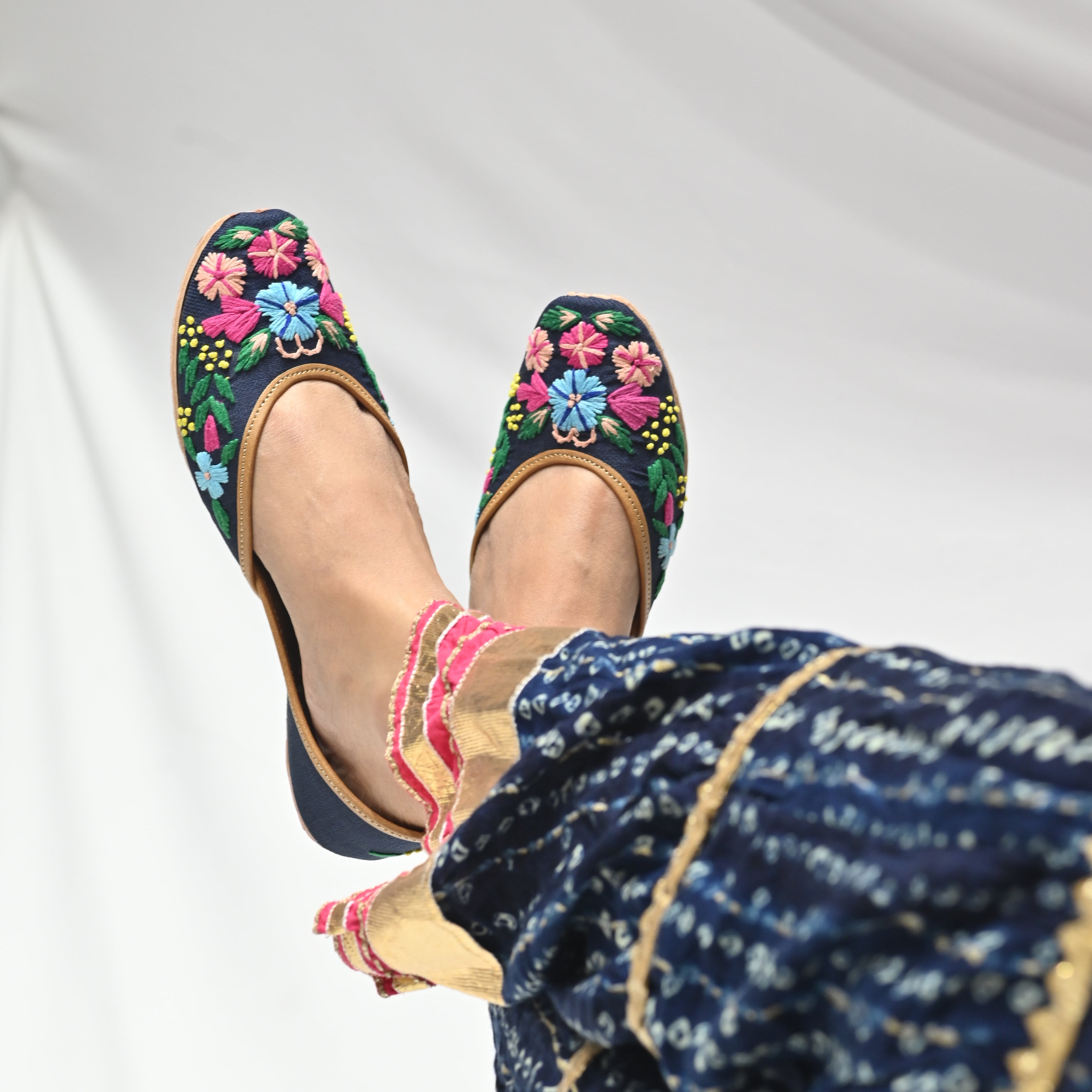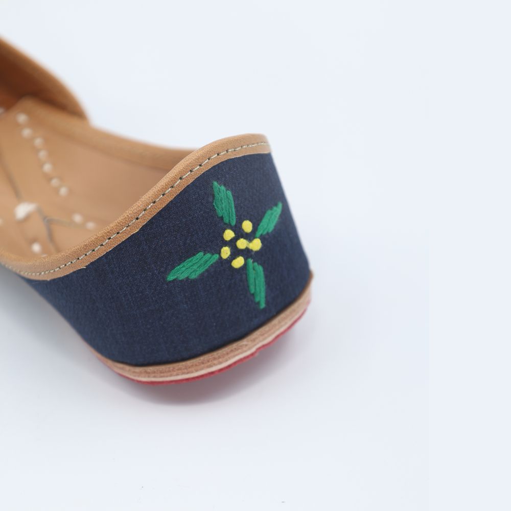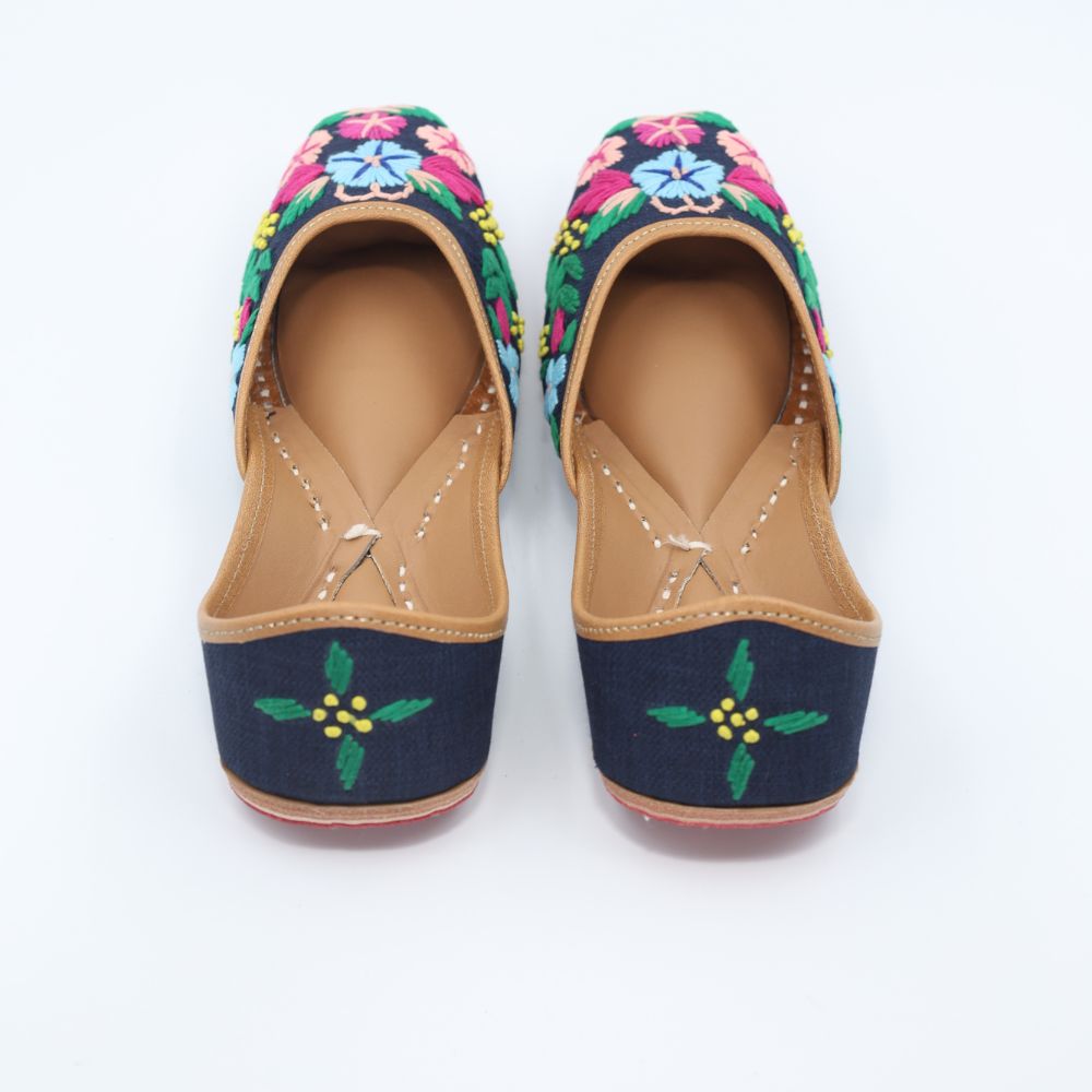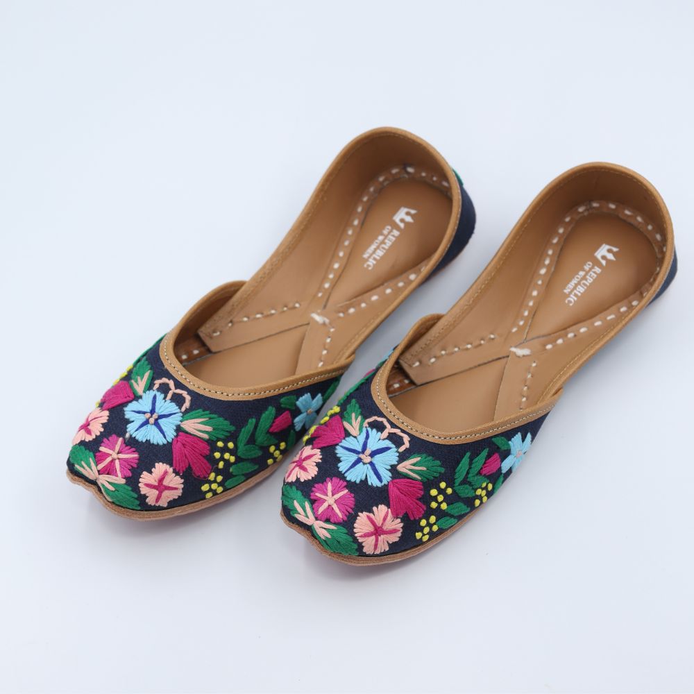 Bold blooms on a deep navy base, this pair is all about contrast and confidence. With intricate multicolour florals embroidered across a midnight canvas, these mojris are your go-to for adding power to pretty.