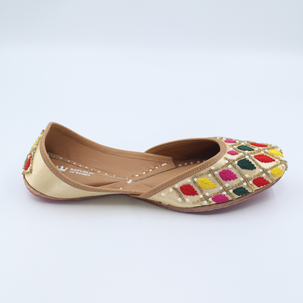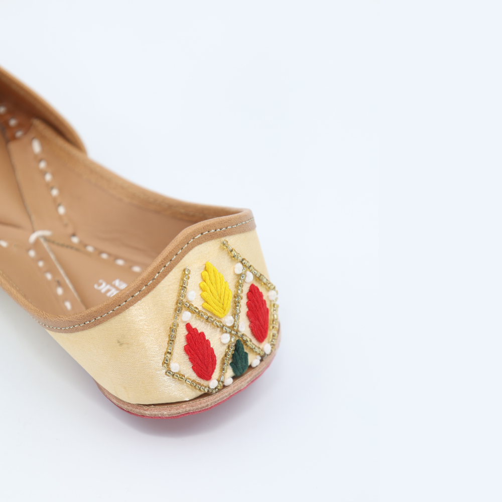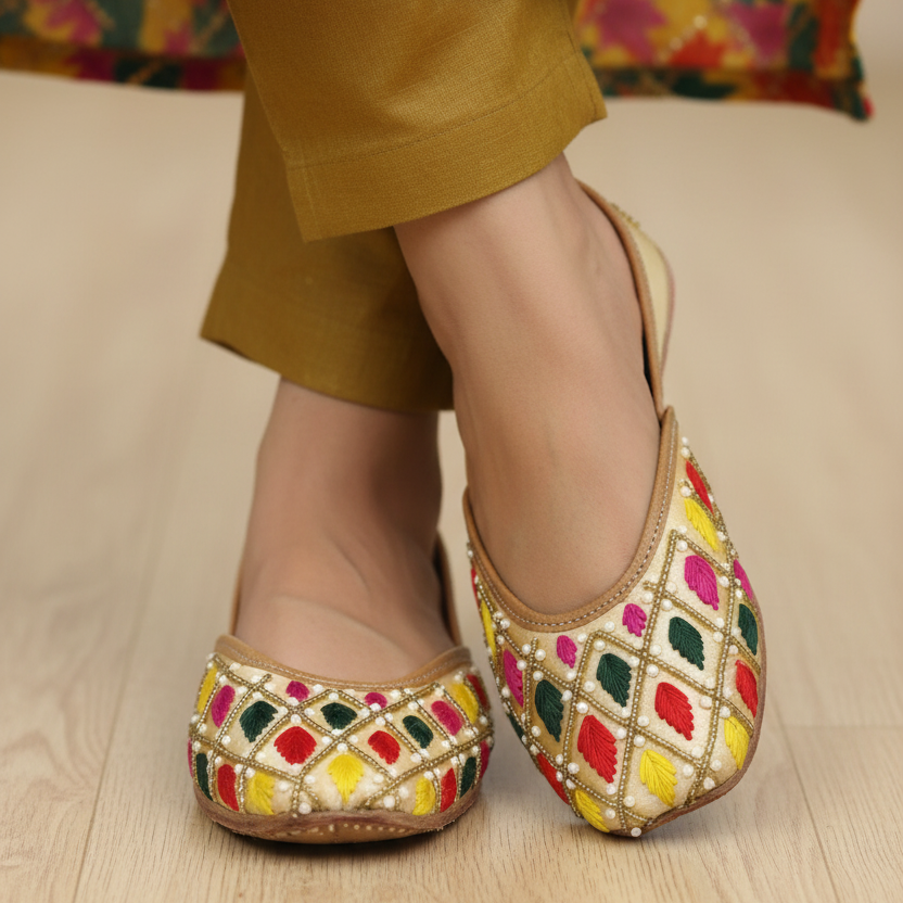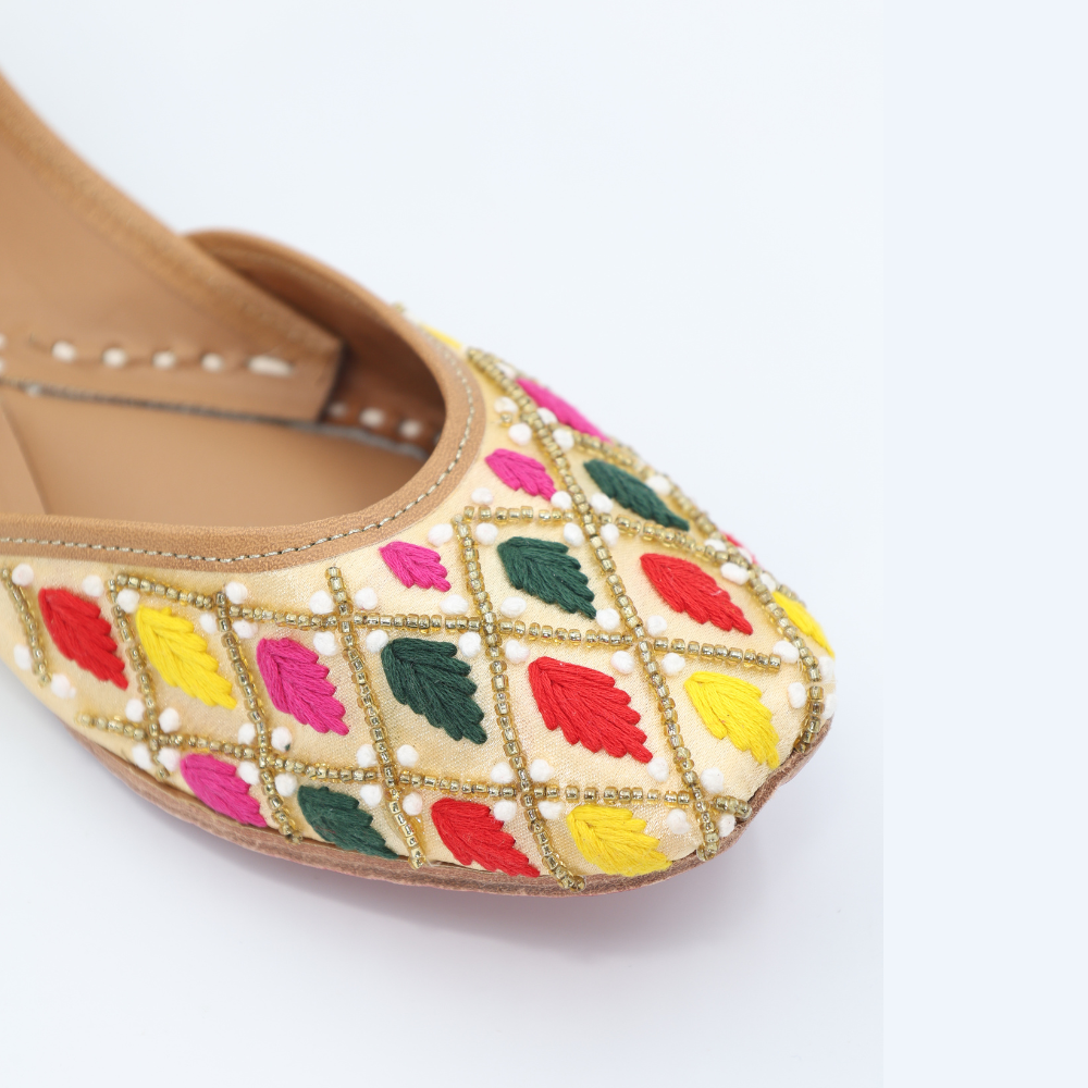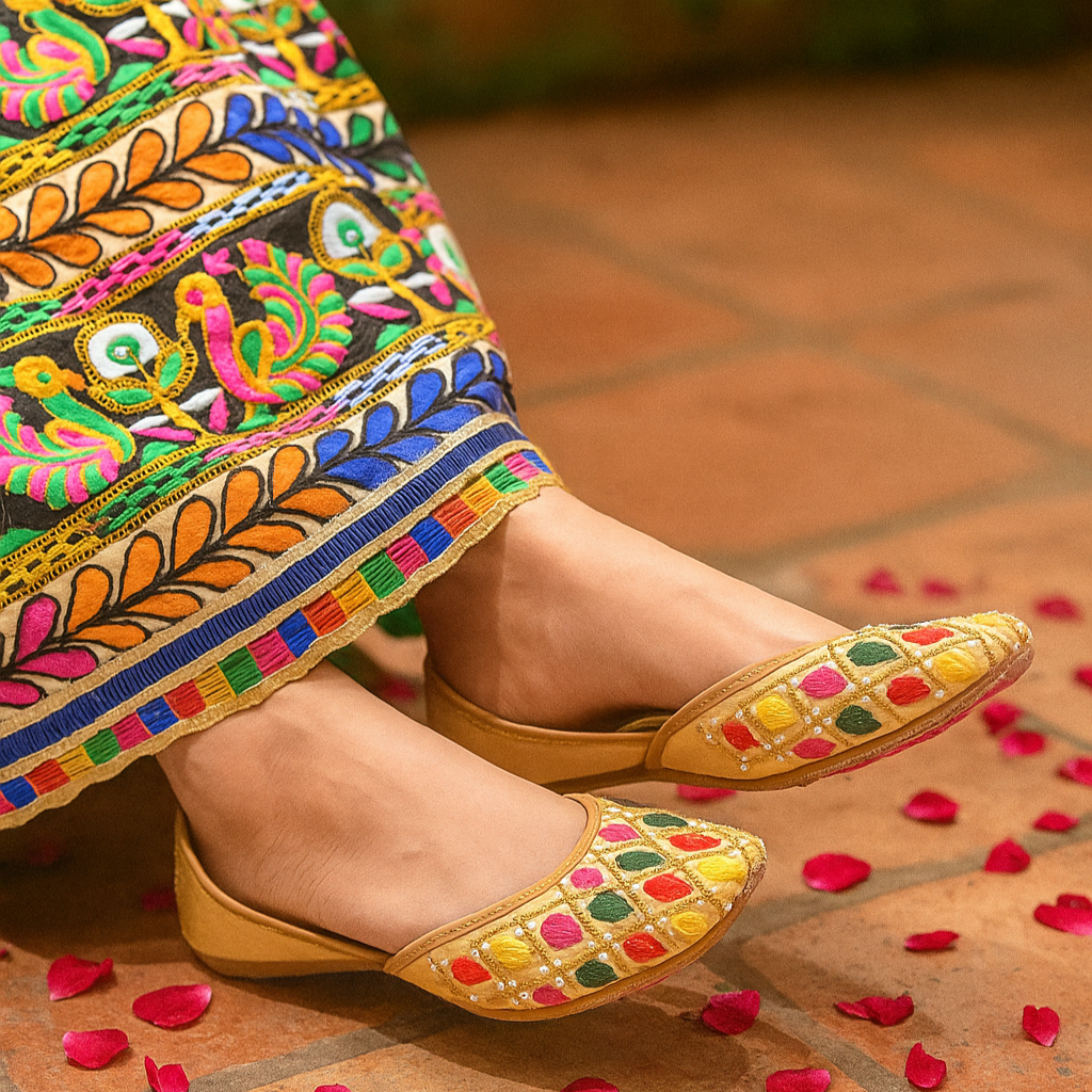 Golden, but never gaudy. These festive mojris bring together rich embroidery with pops of colour, like a guldaan of fresh florals against a luxe base. Lightweight, grounded, and made to move with you, from poojas to parties.