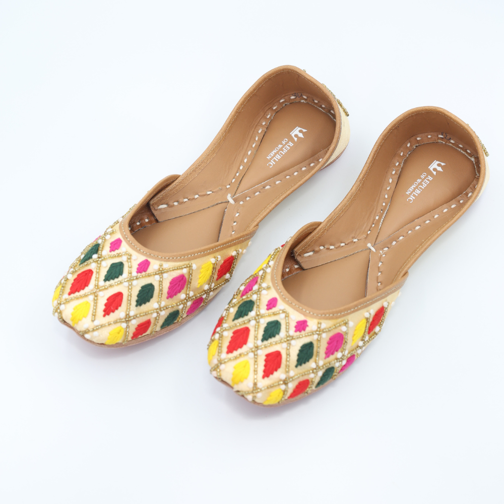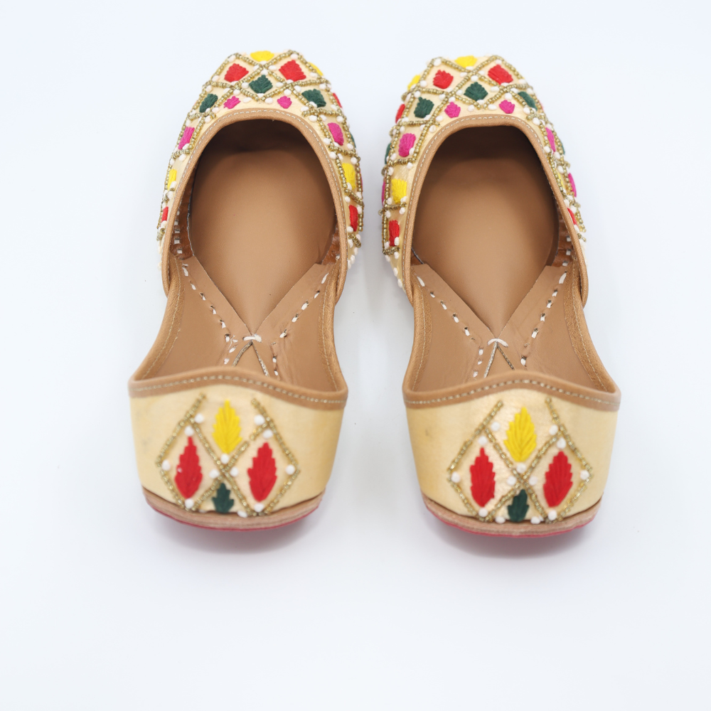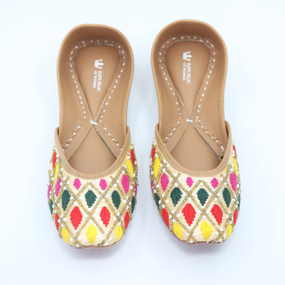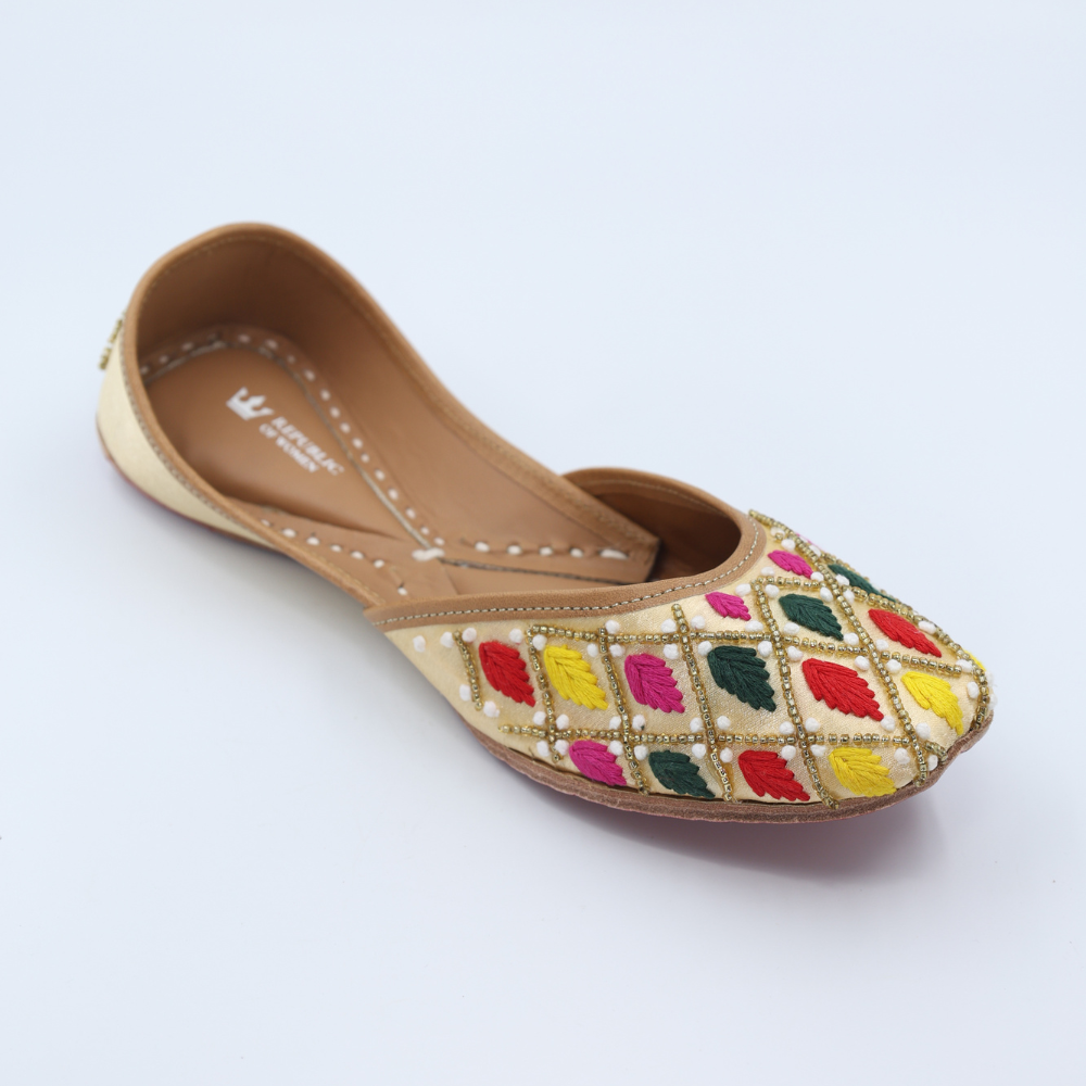 Golden, but never gaudy. These festive mojris bring together rich embroidery with pops of colour, like a guldaan of fresh florals against a luxe base. Lightweight, grounded, and made to move with you, from poojas to parties.