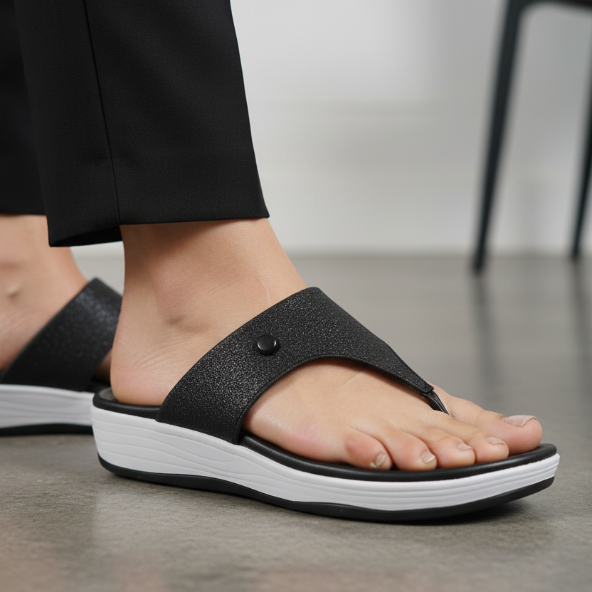 Define your casual elegance with the Onyx Post sandal. This essential toe-post style features a sleek black design and a wide strap with a subtle, upscale texture. The minimalist silhouette is grounded by a comfortable sole highlighted by a sharp white contrast line, adding a modern, graphic element. This sandal is a versatile, foundational piece for a contemporary wardrobe.
