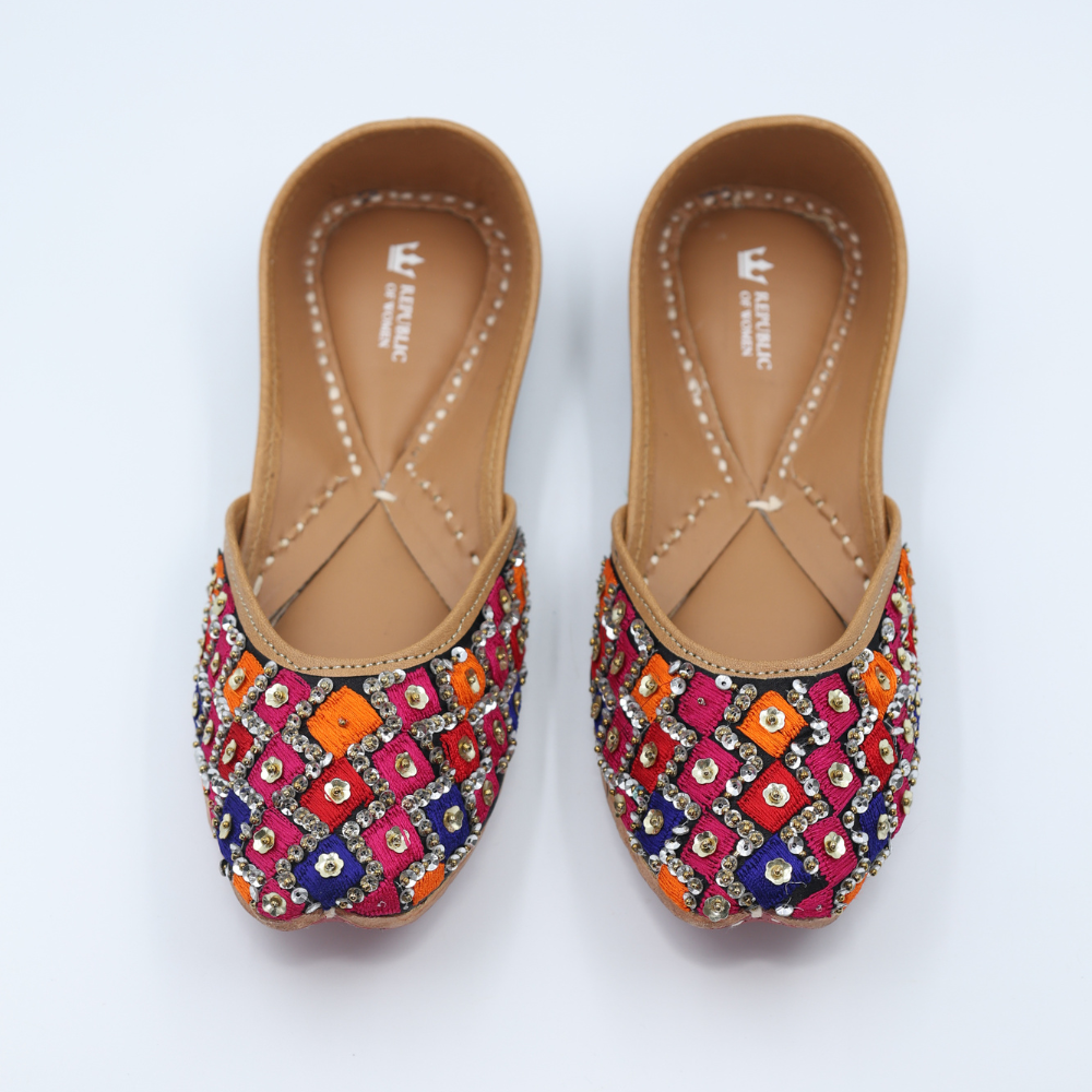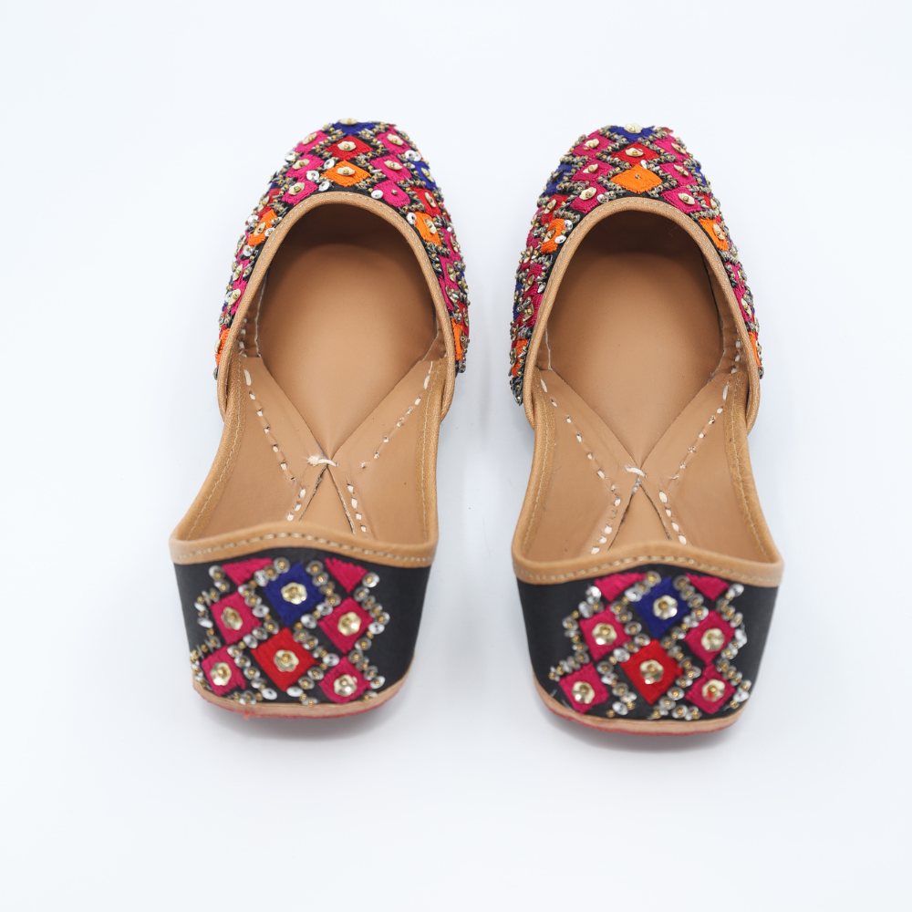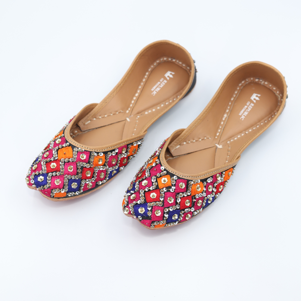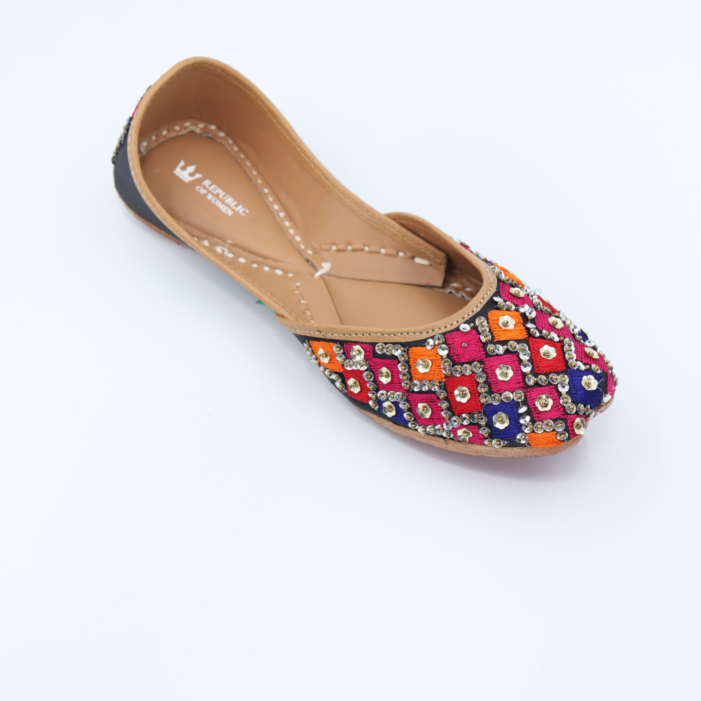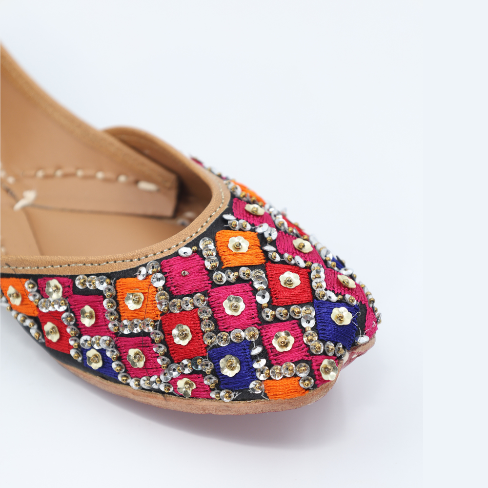 Bright, bold, and unapologetically festive. These mojris bring together hot pink, orange, blue, and black in a striking diamond grid, finished with gleaming kundan-style accents that catch every glimmer of light. Crafted in cloth with a sturdy leather sole, this pair is ready to steal scenes (and hearts).