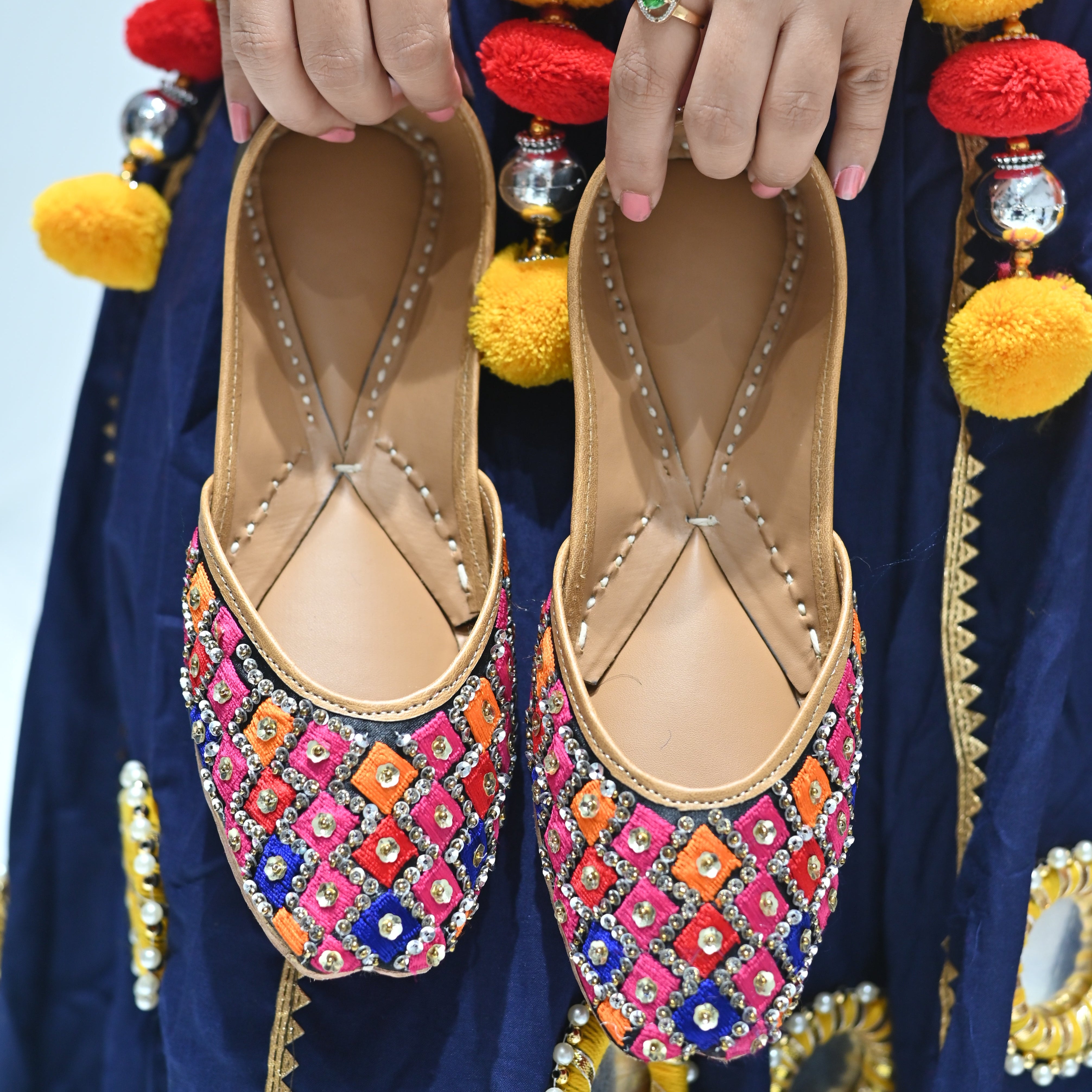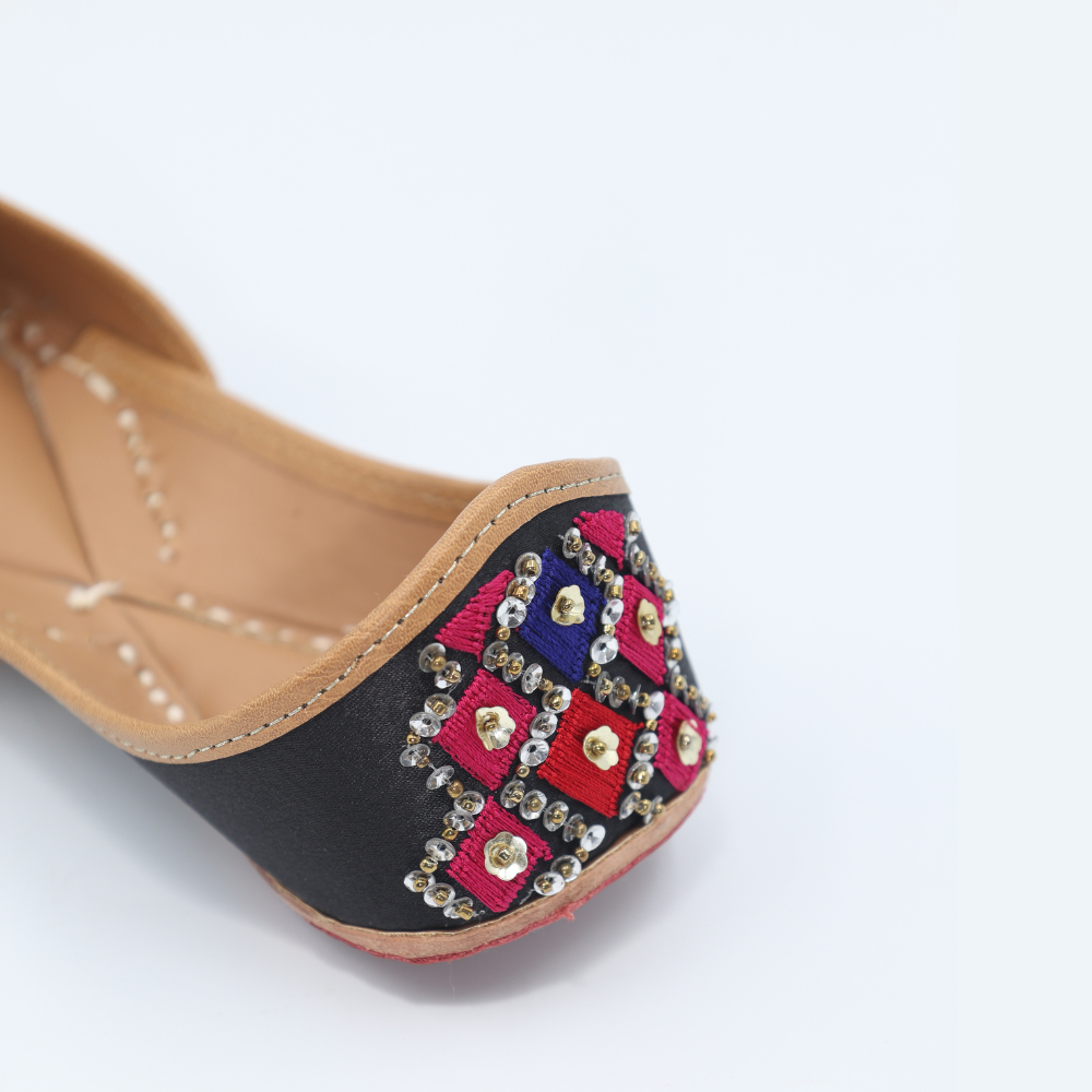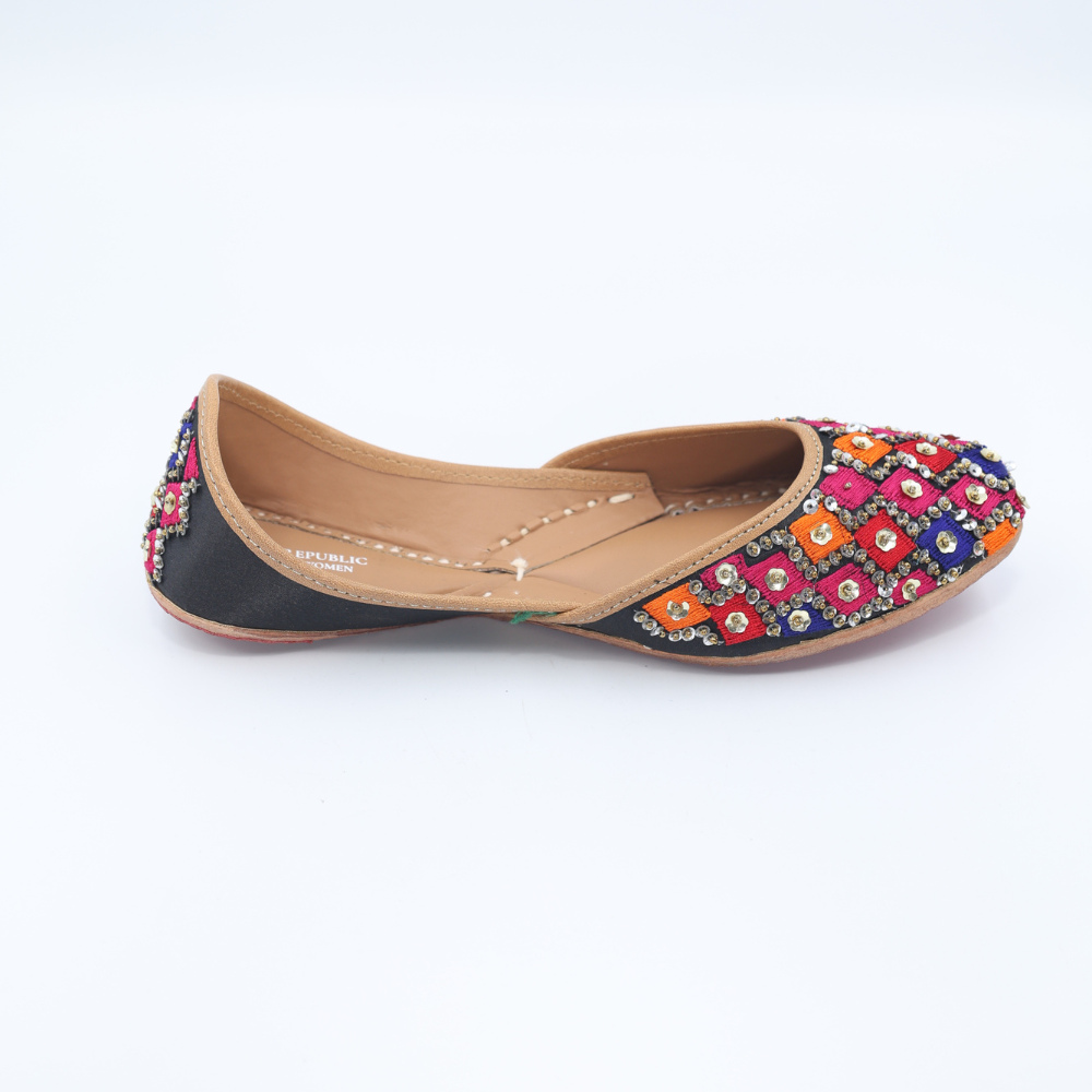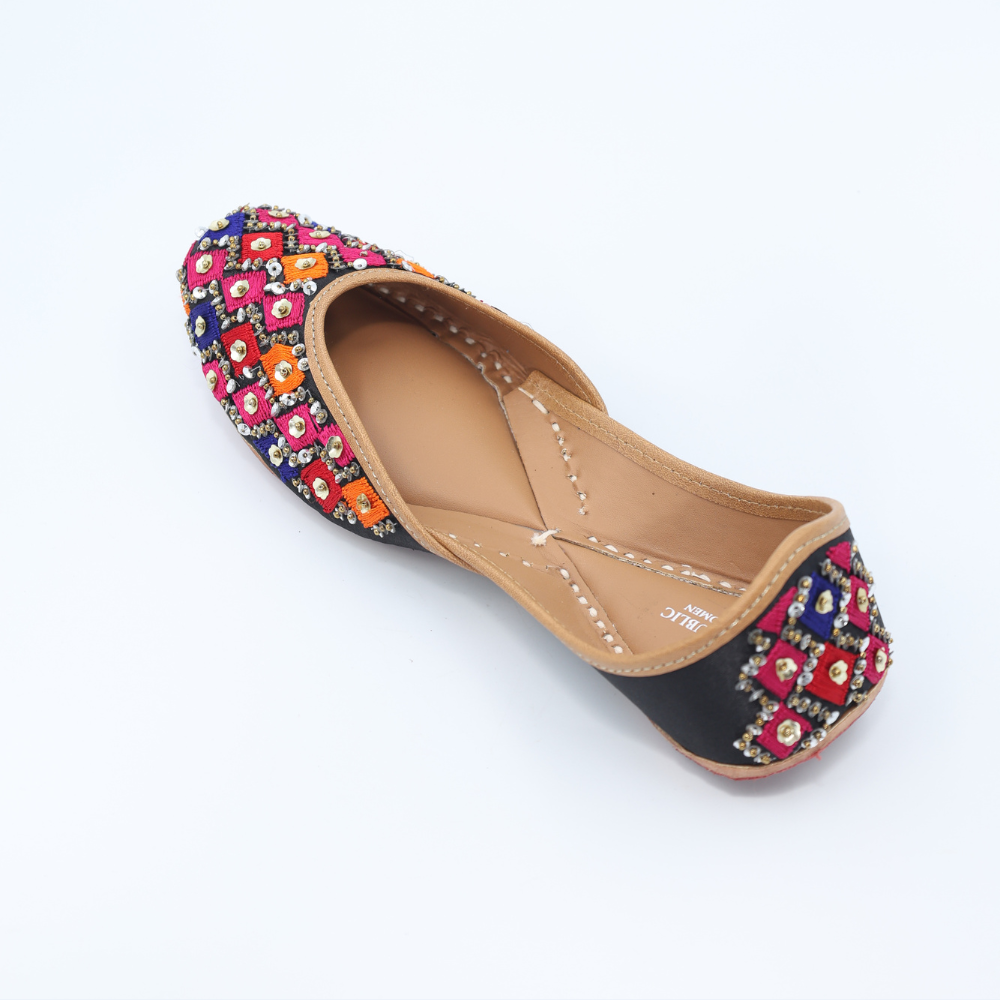 Bright, bold, and unapologetically festive. These mojris bring together hot pink, orange, blue, and black in a striking diamond grid, finished with gleaming kundan-style accents that catch every glimmer of light. Crafted in cloth with a sturdy leather sole, this pair is ready to steal scenes (and hearts).