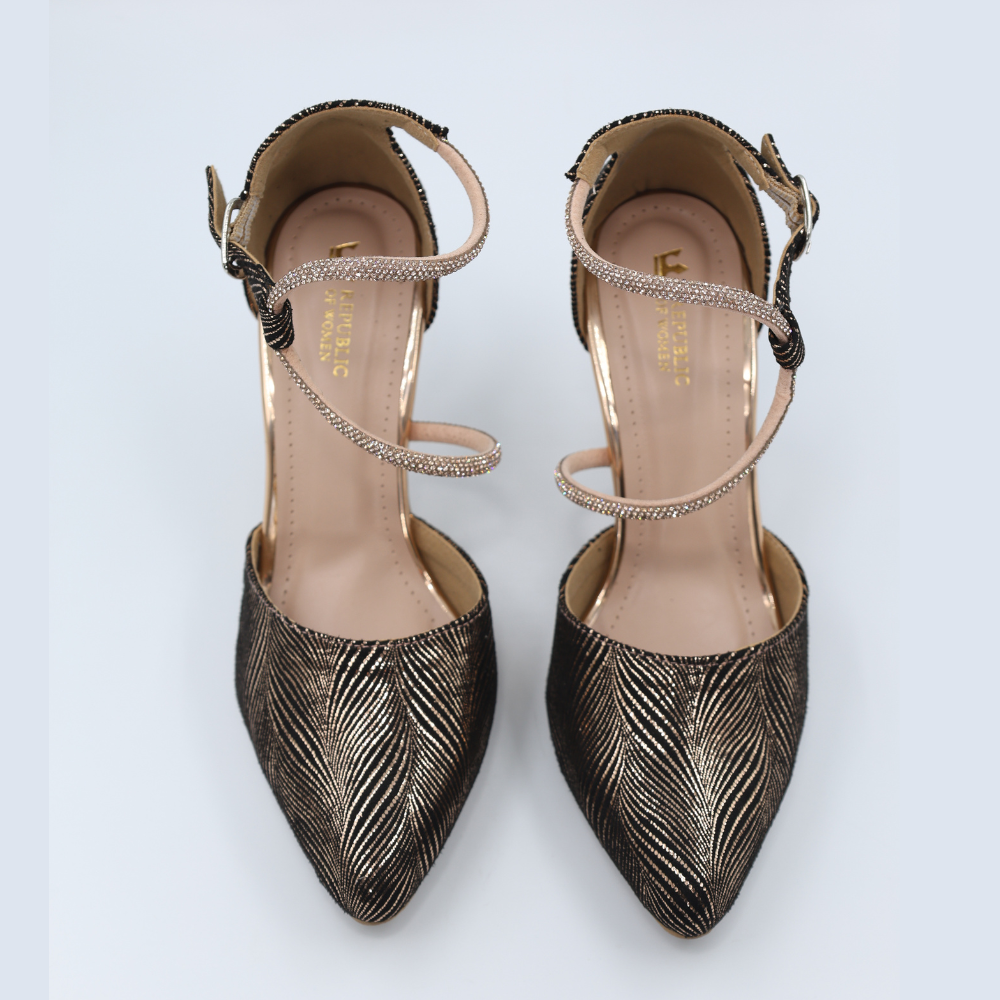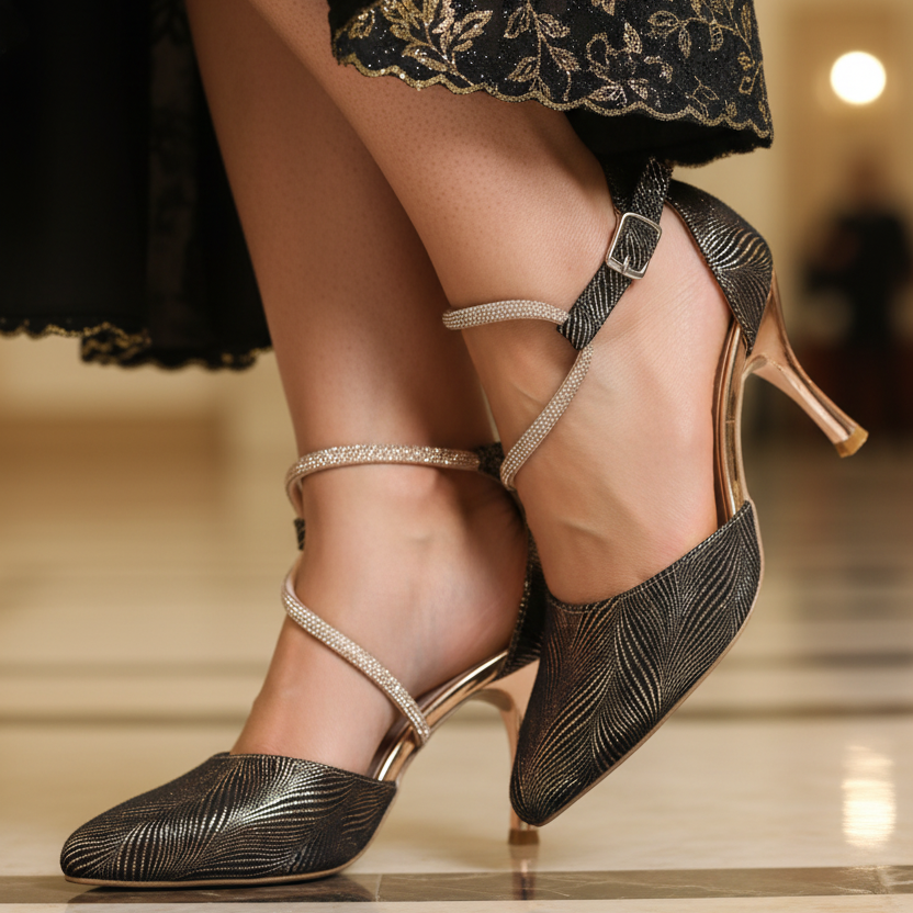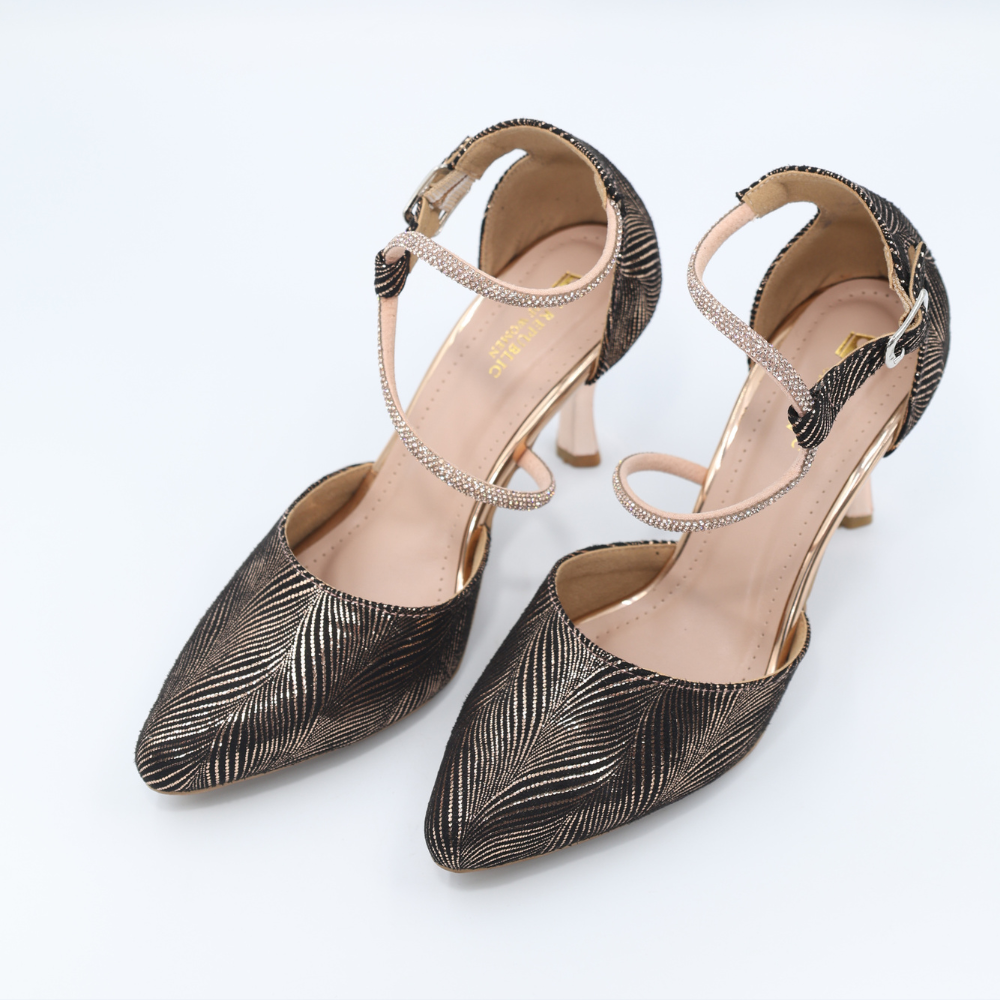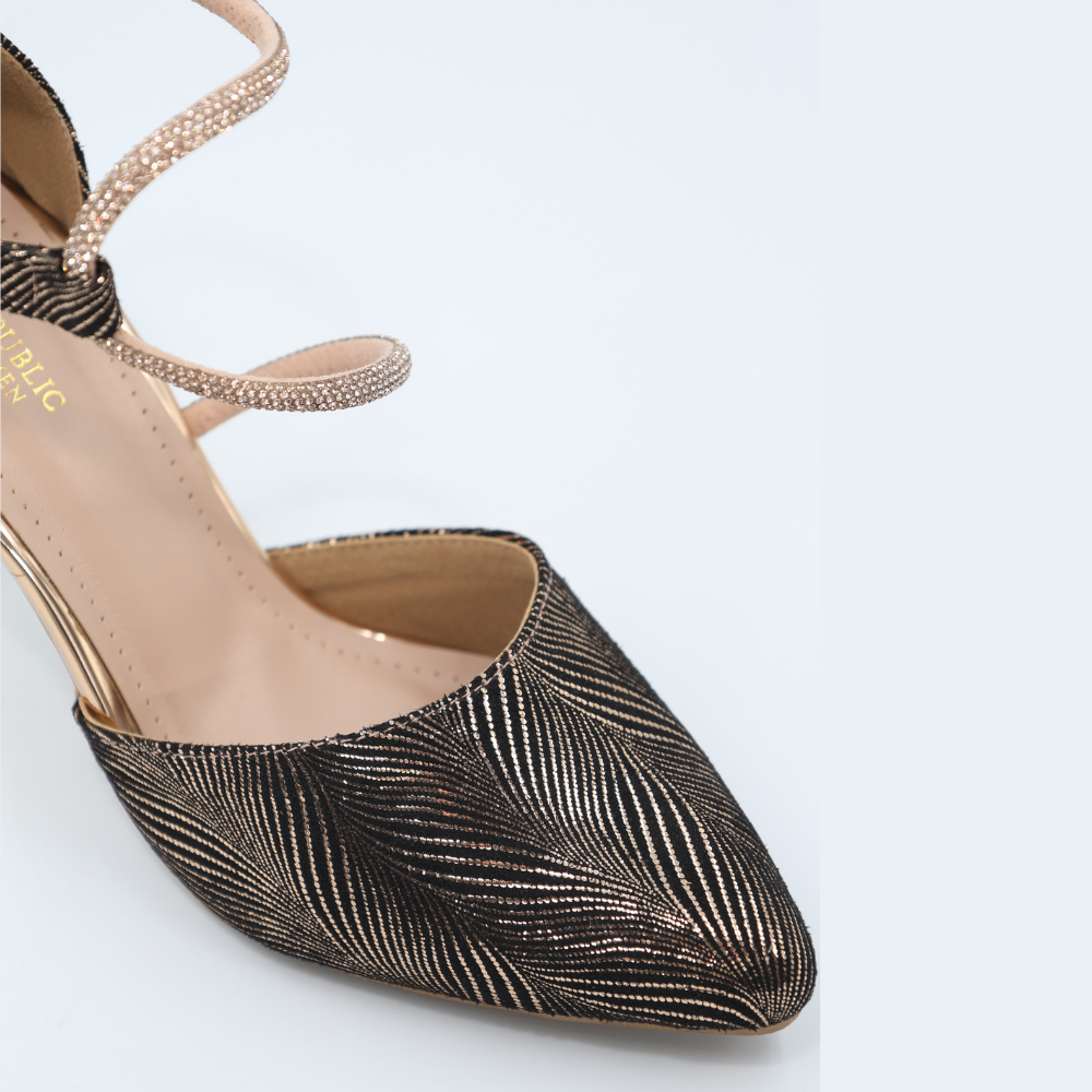 Rosé After Dark is that rare blend of bold and romantic, a sparkling duo of black and rose gold that catches the light and compliments. With a pointed toe, adjustable slingback, and glam finish, this pair is perfect for weddings, wine nights, and all things wow.