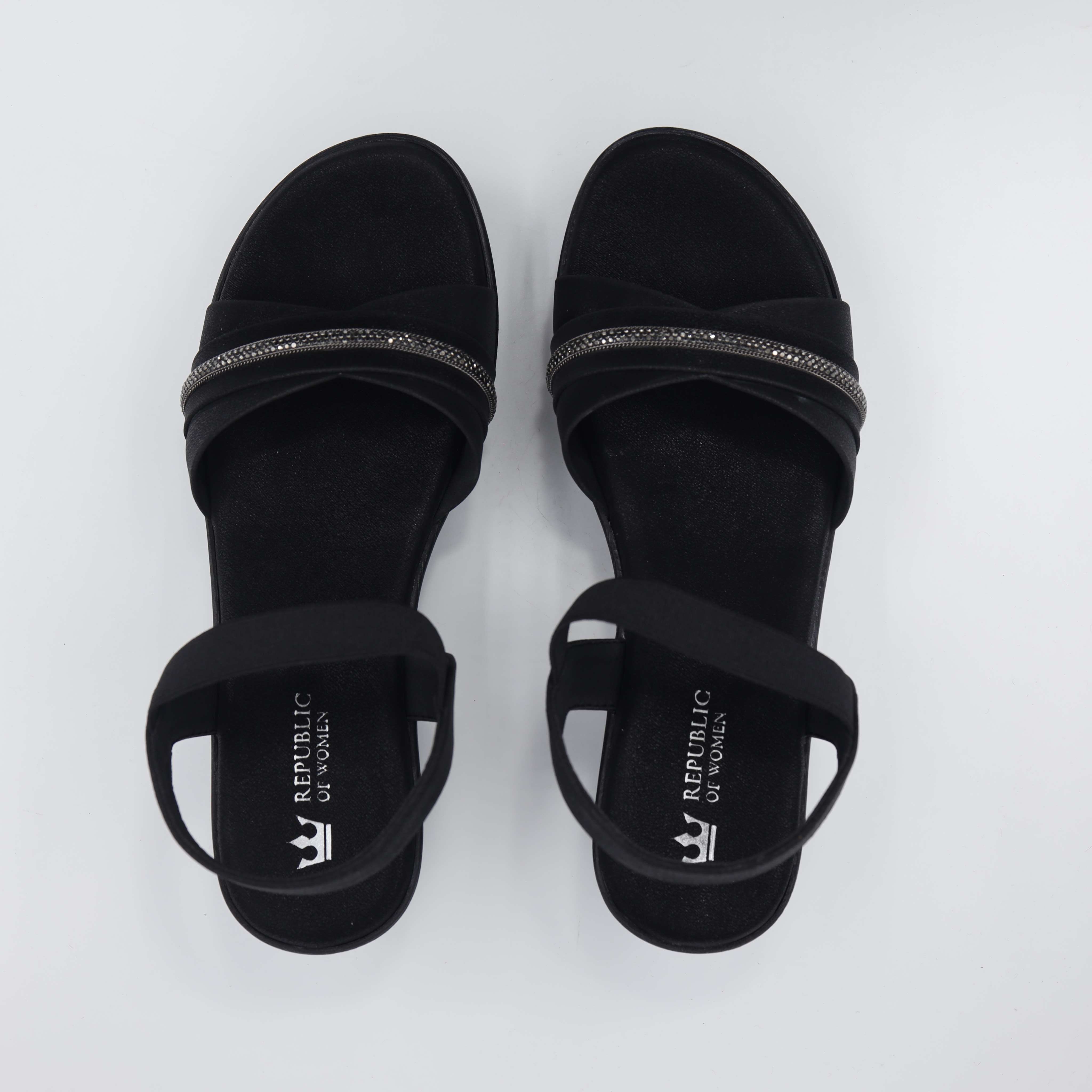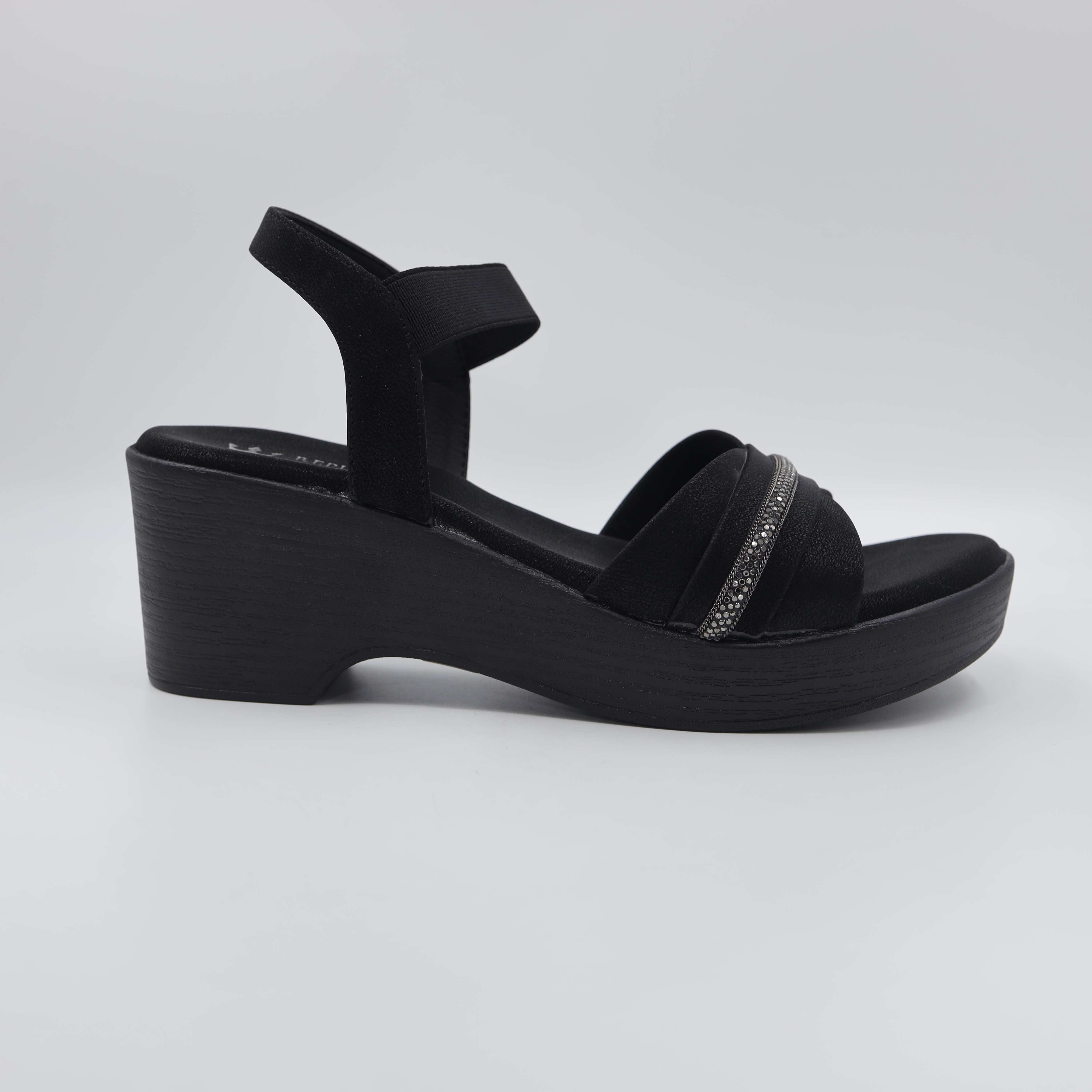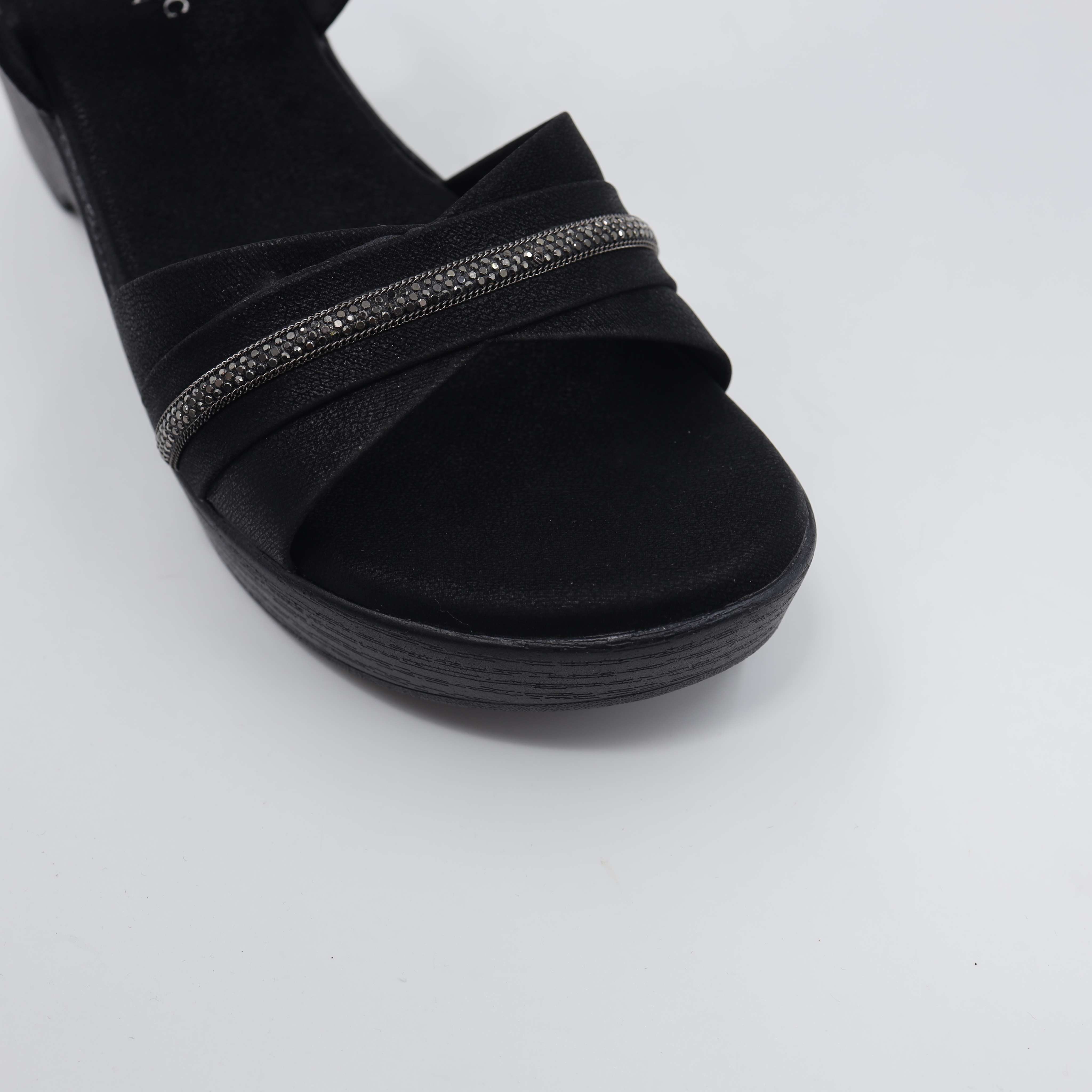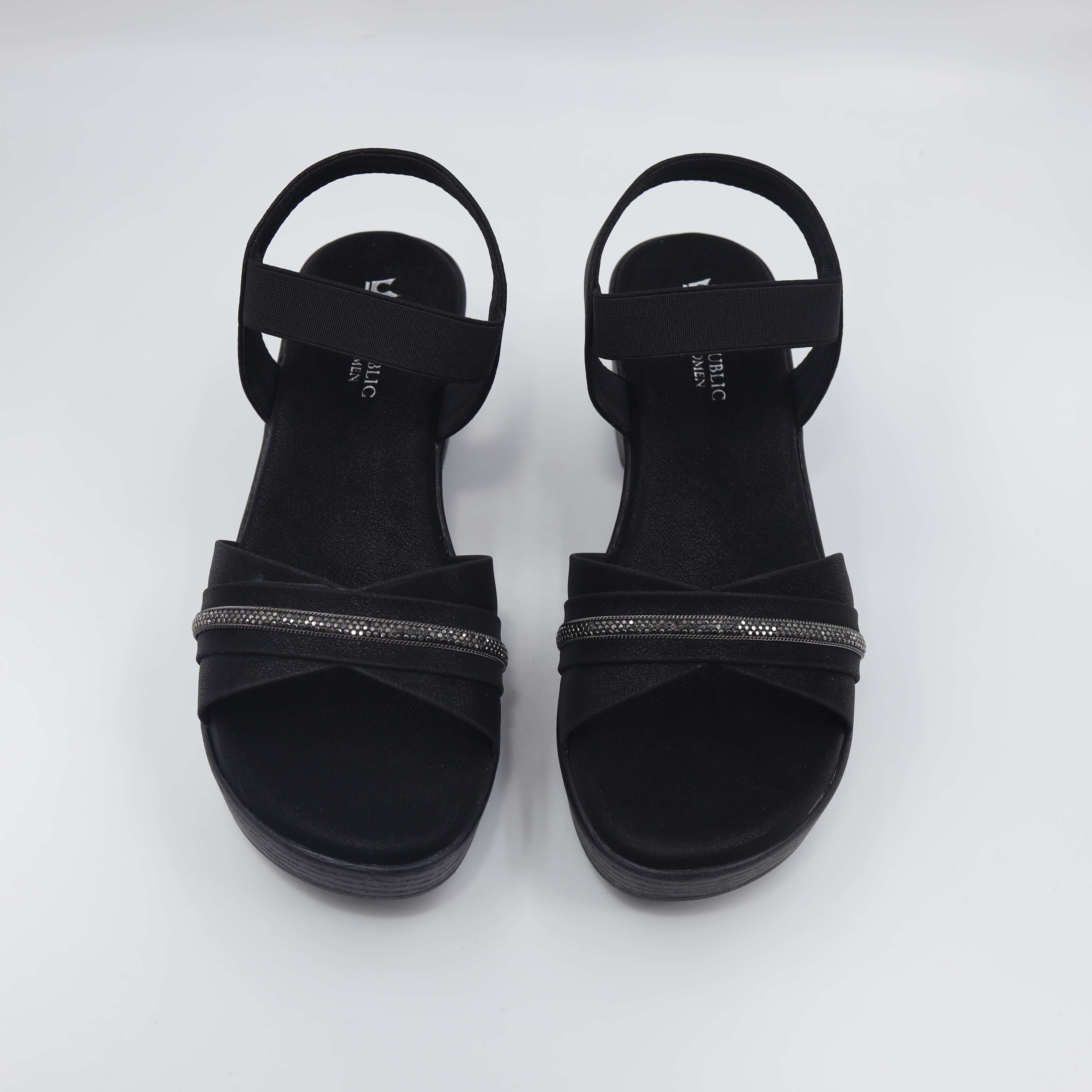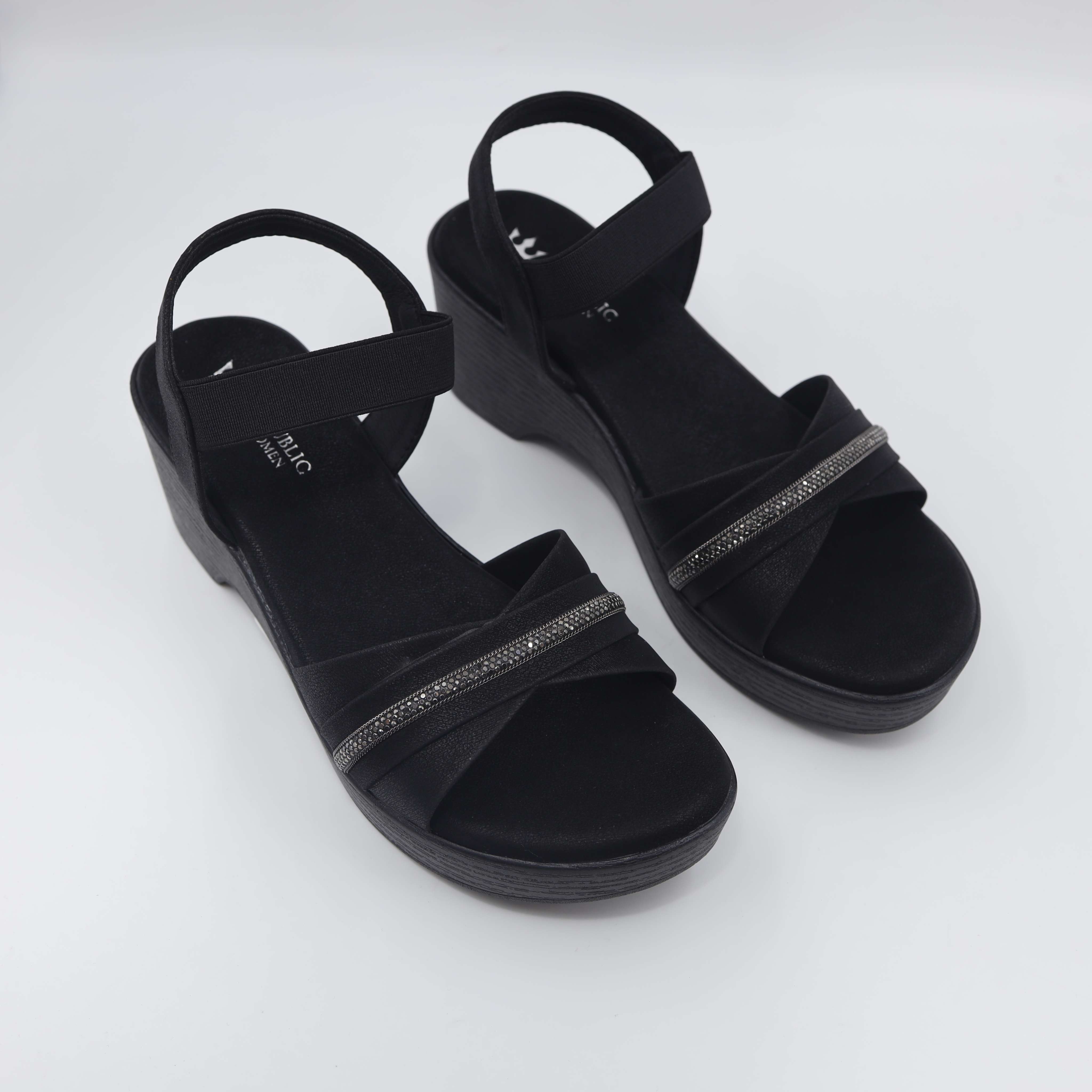 Draped in timeless black, this handcrafted wedge sandal embodies quiet power and refined elegance. The softly padded upper is adorned with a subtle embellished band that catches the light with restrained majesty, while the secure ankle strap offers effortless stability. Set on a comfortable 2.5-inch heel, it is designed to support long hours without compromising poise, making it a versatile companion from day to dusk.