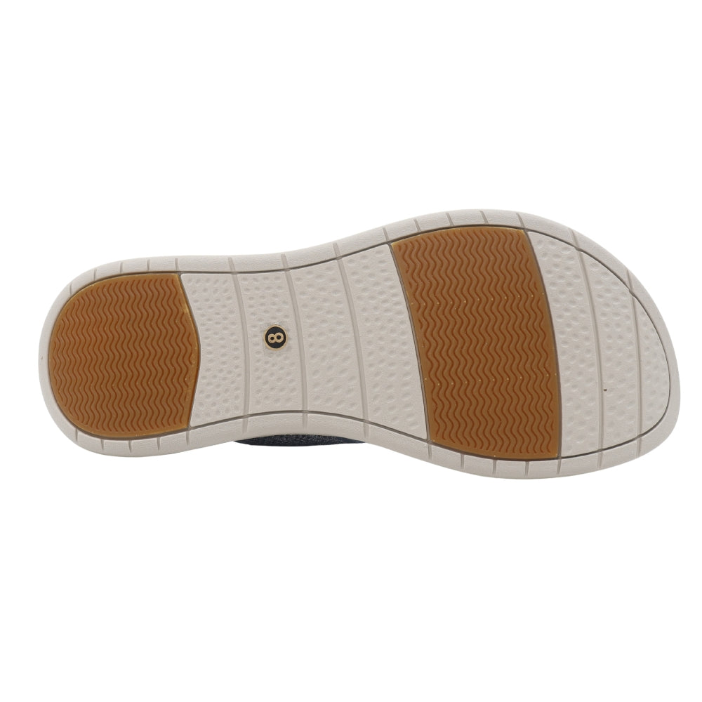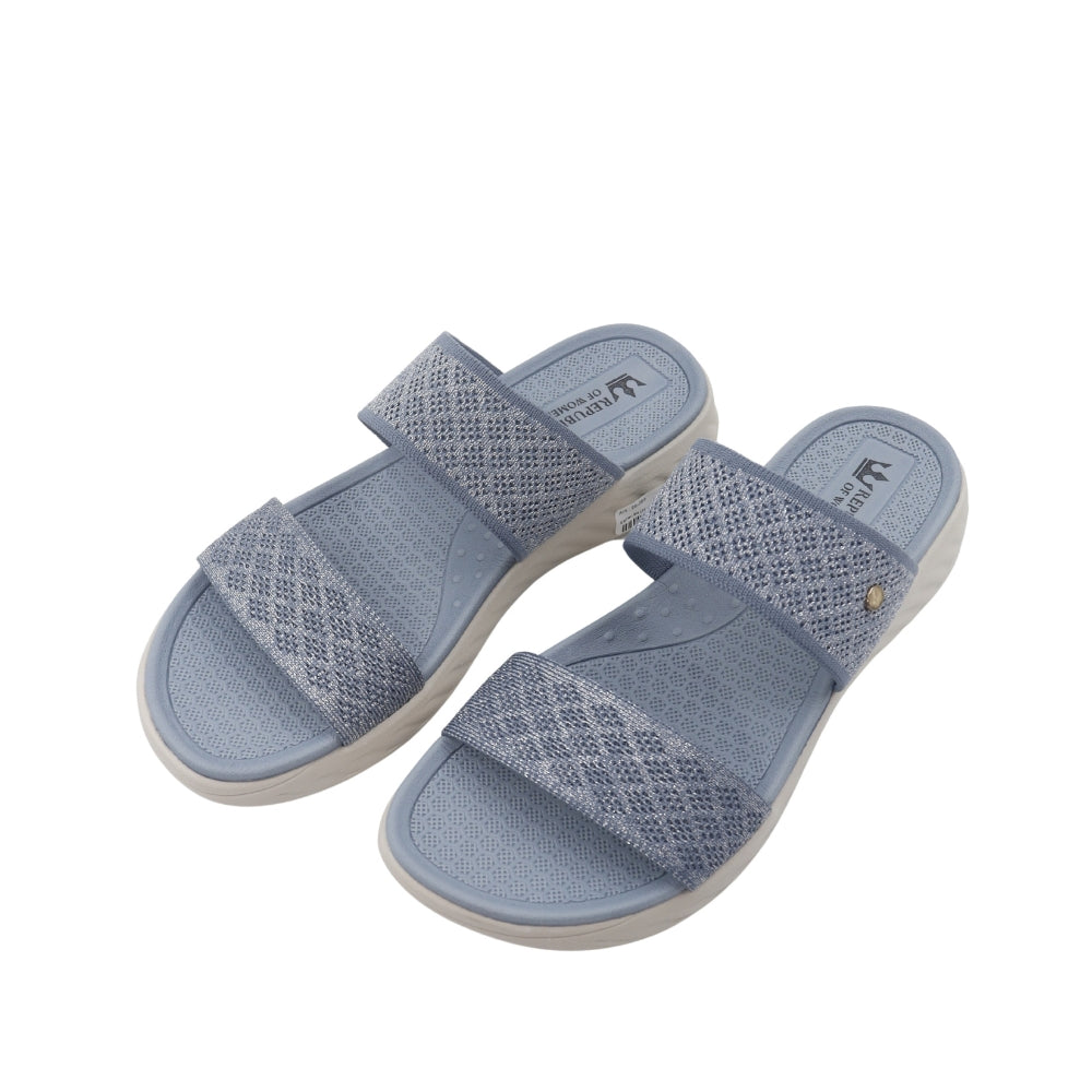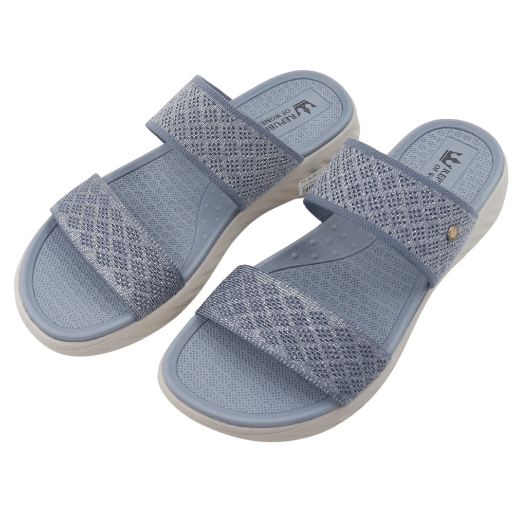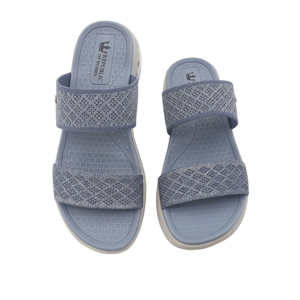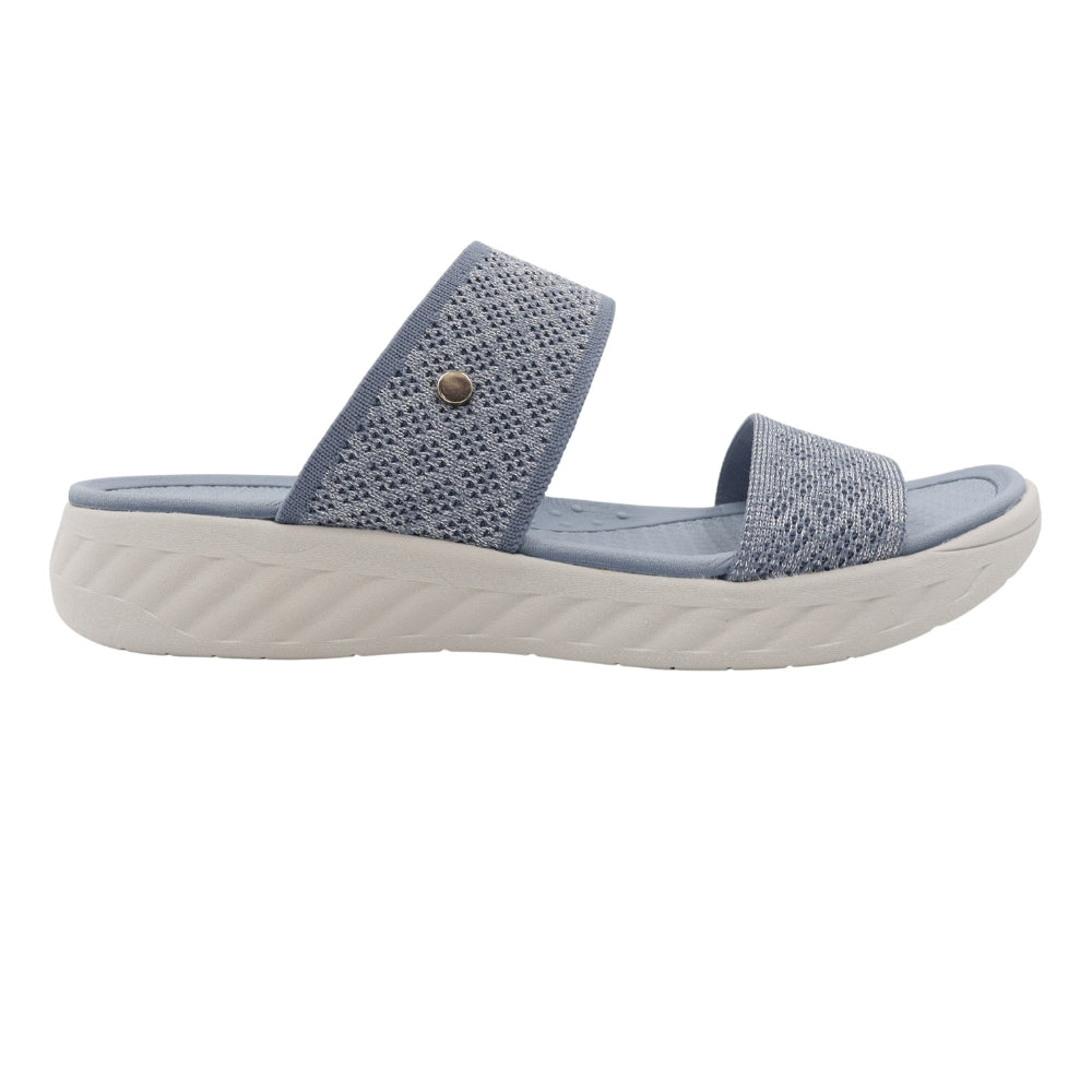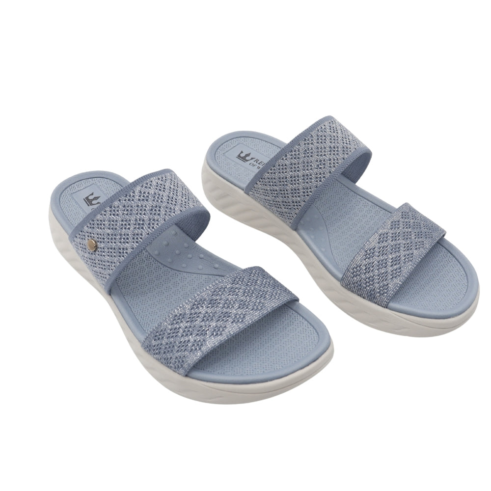 Experience weightless comfort with the Sky Knit slide. Designed for superior ease, this sandal features an ergonomic, contoured footbed and a lightweight EVA sole for all-day support. The upper showcases two wide, beautifully knit bands in a serene blue hue, offering a soft, breathable, and secure fit. This slide is the perfect choice for elevated, effortless casual wear, adding a serene touch to any ensemble.