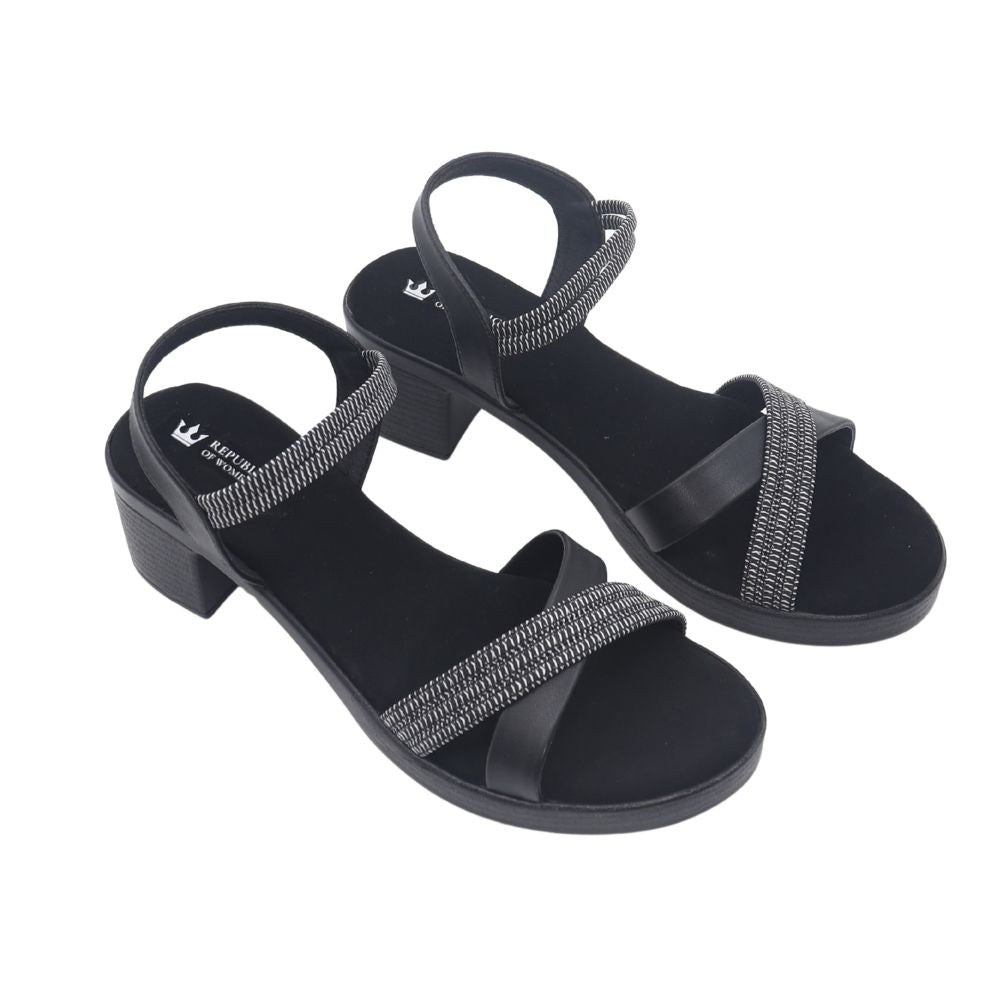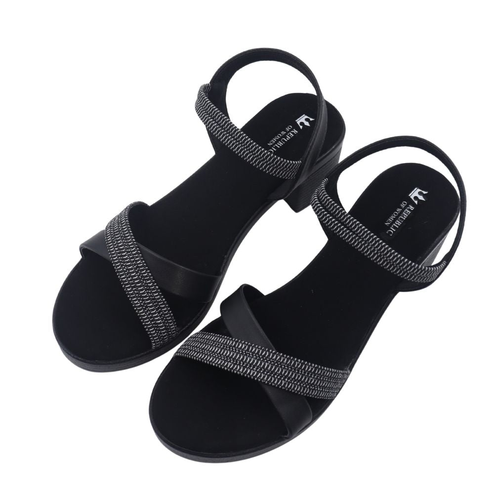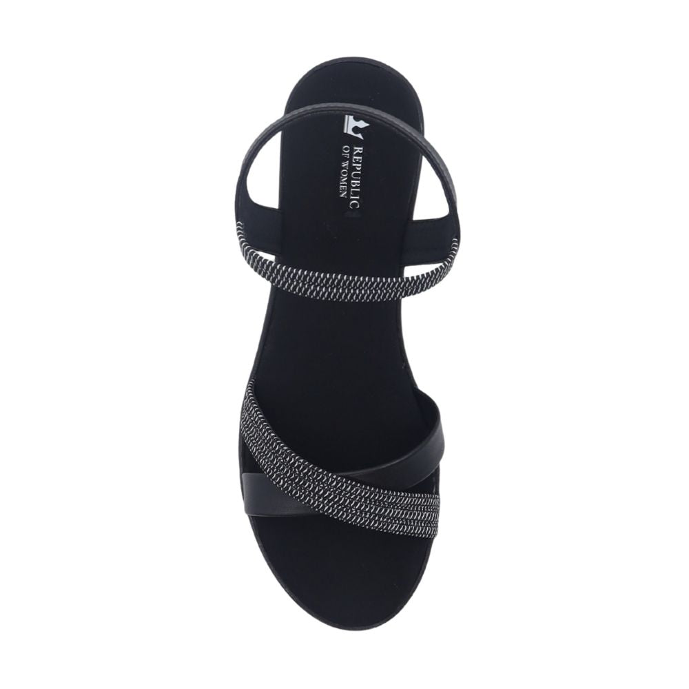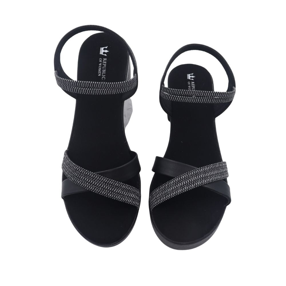Define your elegance with the Strata Cross sandal. This versatile black flat features a contemporary design with criss-cross forefoot straps that combine textures—one smooth, the other intricately detailed with a fine metallic/textured pattern. The simple ankle strap ensures a secure fit, while the flat base provides all-day comfort, making this sandal the ideal foundation for a polished, modern wardrobe.