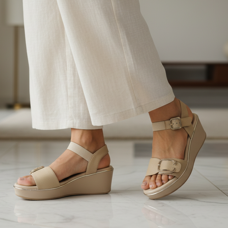 Step into effortless style with the Texture Glide sandal. This low-heeled design features a wide forefoot strap showcasing an elegant contrast between smooth material and a central textured panel, all accentuated by delicate metallic piping. The soft, elasticated heel strap ensures a secure and comfortable fit, while the low block heel provides perfect elevation for all-day wear.