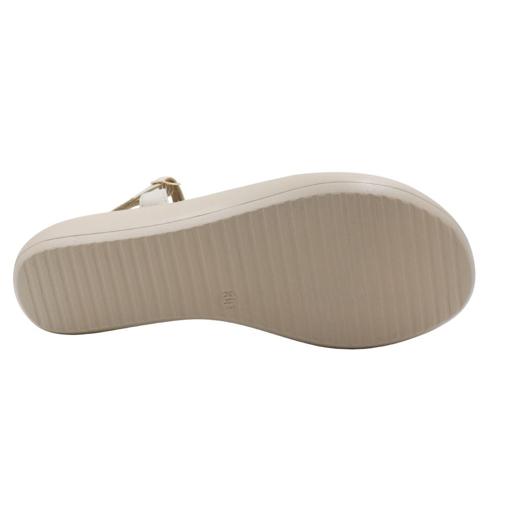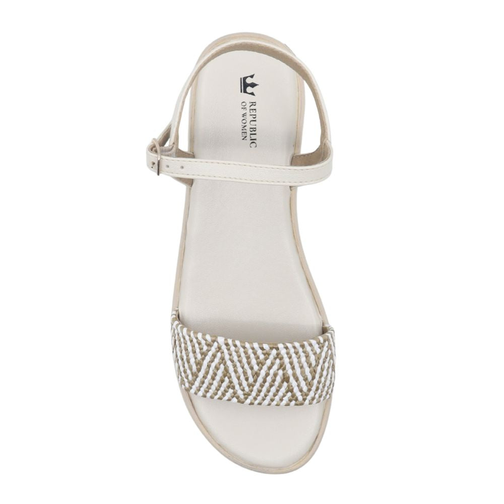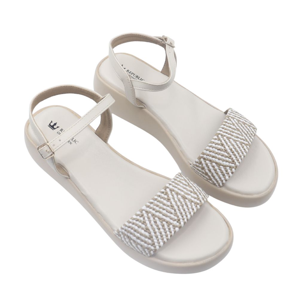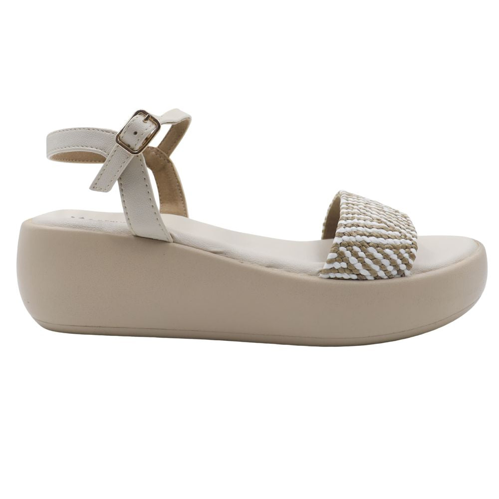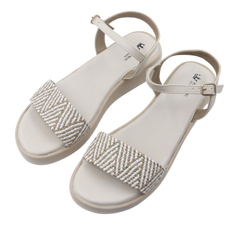 Step into vacation elegance with the Woven Riviera sandal. This eye-catching platform features a modern, comfortable base and a striking wide forefoot strap adorned with a contrasting white and tan woven zig-zag pattern. The classic ankle strap with an adjustable buckle ensures a secure fit, while the chunky sole provides elevation and lasting comfort. This sandal is your perfect companion for luxurious summer days.